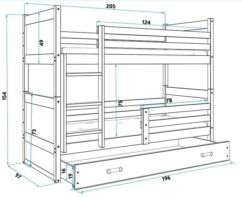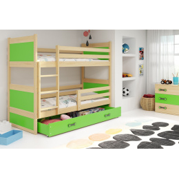 Dětská patrová postel Riky je určena pro ty, kteří pro své dítě hledají funkčnost, moderní design a kvalitu. Postel je vyrobena z borovicového dřeva v kombinaci s MDF deskou (barevné panely na bocích postele). Její stabilní konstrukce, zaoblené hrany a zábrana na horní i dolní posteli, zajišťují bezpečnost a pohodlí dítěte. Žebřík si můžete podle potřeby umístit na pravou, nebo levou stranu postele. Když děti patrová postel omrzí, je možno palandu rozložit na dvě samostatné postele. Součástí postele je 2x zábrana, praktický úložný prostor na kolečkách, 2x rošt a 2x pěnová matrace s doporučenou nosností do 70 kg. Tloušťka matrace je 7cm. Plocha pro spaní je 2x 90x200 cm. Postel je dodávána v demontu a součástí je montážní plánek včetně všech potřebných spojovacích materiálů. Vyobrazené dekorace nejsou v ceně. Zobrazení barev na fotografii se může od skutečnosti nepatrně lišit.