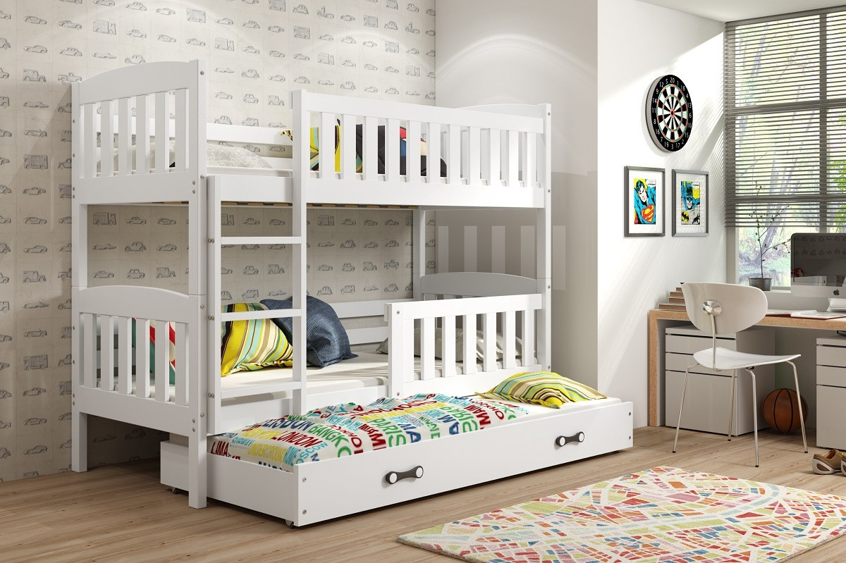 Dětská patrová postel Kuba je výbornou volbou všech rodičů, kteří pro své dítě hledají funkčnost, moderní design a kvalitu. Postel je vyrobena z kvalitního borovicového dřeva. Její stabilní konstrukce, zaoblené hrany a zábrana na horní i dolní posteli, zajišťují bezpečnost a pohodlí dítěte. Žebřík si můžete podle potřeby umístit na pravou, nebo levou stranu postele. Když děti patrová postel omrzí, je možno palandu rozložit na dvě samostatné postele. Součástí postele je také praktická přistýlka s matrací, kterou můžete využít pro další dítě, nebo když u Vašich dětí bude chtít přespat kamarád/ka. Všechny části postele mají rošt a pěnovou matraci v ceně. Tloušťka matrace je 7cm. Plocha pro spaní je 90x200 cm (vrchní a spodní část) a 80x190 cm (přistýlka). Postel je dodávána v demontu a součástí je montážní plánek včetně všech potřebných spojovacích materiálů. Vyobrazené doplňky a dekorace nejsou v ceně.Z obrazení barev na fotografii se může od skutečnosti nepatrně lišit.