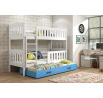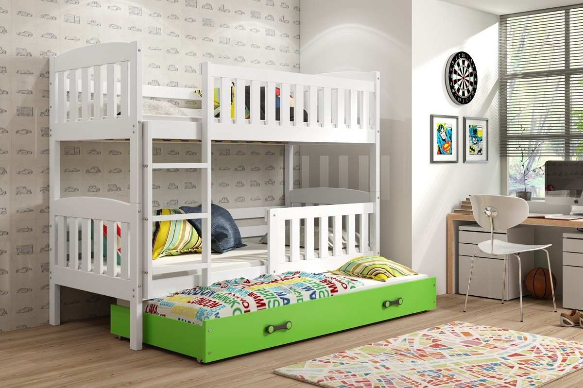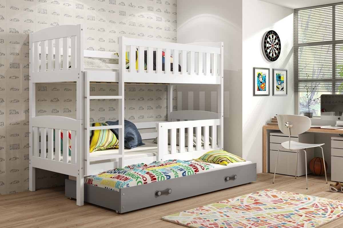 Dětská patrová postel Kuba je výbornou volbou všech rodičů, kteří pro své dítě hledají funkčnost, moderní design a kvalitu. Postel je vyrobena z kvalitního borovicového dřeva. Její stabilní konstrukce, zaoblené hrany a zábrana na horní i dolní posteli, zajišťují bezpečnost a pohodlí dítěte. Žebřík si můžete podle potřeby umístit na pravou, nebo levou stranu postele. Když děti patrová postel omrzí, je možno palandu rozložit na dvě samostatné postele. Součástí postele je také praktická přistýlka s matrací, kterou můžete využít pro další dítě, nebo když u Vašich dětí bude chtít přespat kamarád/ka. Všechny části postele mají rošt a pěnovou matraci v ceně. Tloušťka matrace je 7cm. Plocha pro spaní je 90x200 cm (vrchní a spodní část) a 80x190 cm (přistýlka). Postel je dodávána v demontu a součástí je montážní plánek včetně všech potřebných spojovacích materiálů. Vyobrazené doplňky a dekorace nejsou v ceně.Z obrazení barev na fotografii se může od skutečnosti nepatrně lišit.