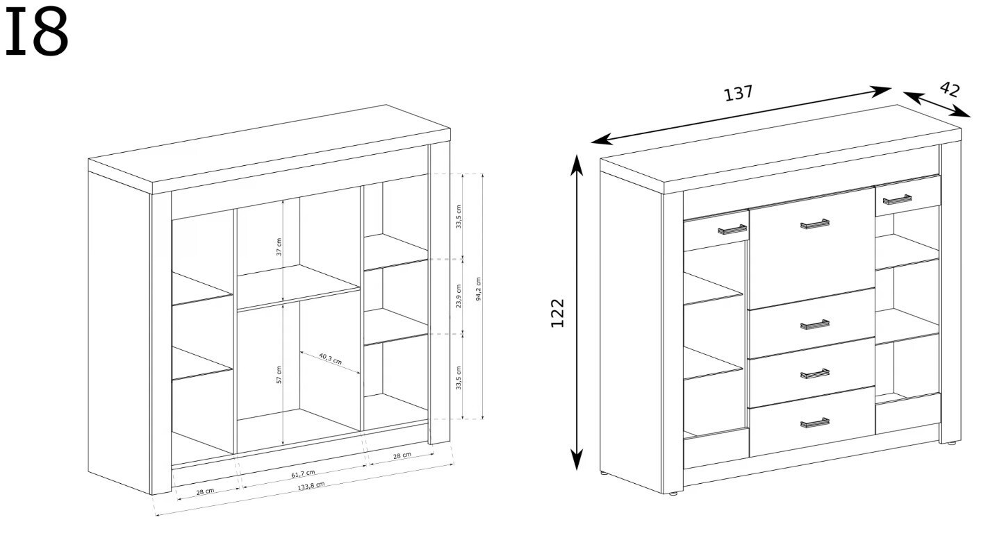 Vysoká komoda s vitrínami po stranách s dvojitými skleněnými policemi uprostřed. Uprostřed máme tři hluboké zásuvky a bar. Vitríny jsou ideální pro vystavení knih, porcelánu nebo suvenýrů. Nábytek má dostatek prostoru, je prostorný a originálního vzhledu. Hodí se do každé místnosti, obývacího pokoje, jídelny nebo předsíně. Svým designem zaujme mnoho hostů. Kovové úchytky podtrhují smysl pro detail. Nábytek je možné zakoupit s plnými čely. K dostání ve třech barvách.