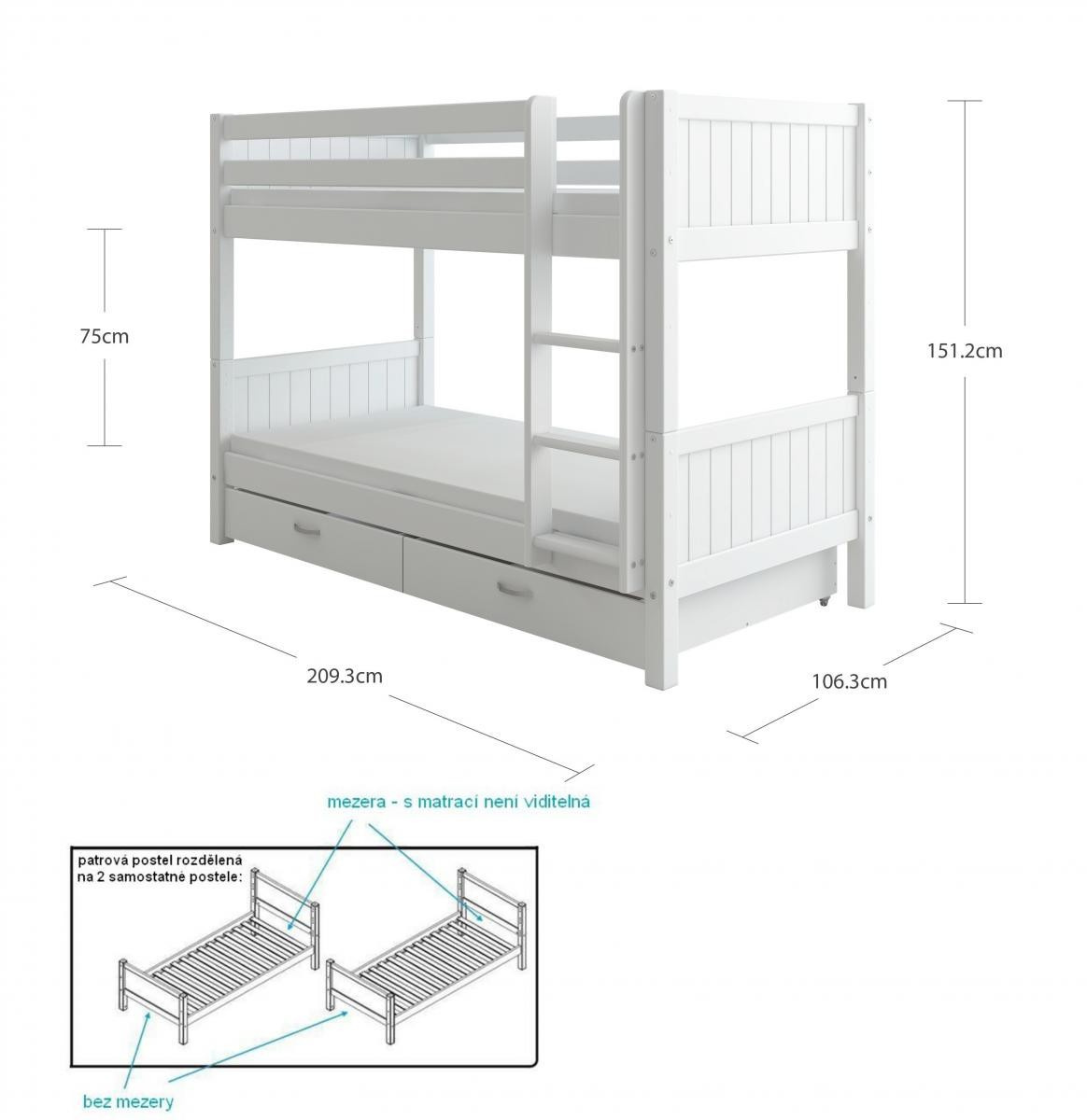 Zboží je dodáváno v demontu BEZ MATRACÍ. Doporučujeme dokoupit 2ks matrace 90 x 200 cm. Součástí je schematický návod na montáž včetně všech spojovacích prvků. Vyobrazené doplňky a dekorace nejsou v ceně.