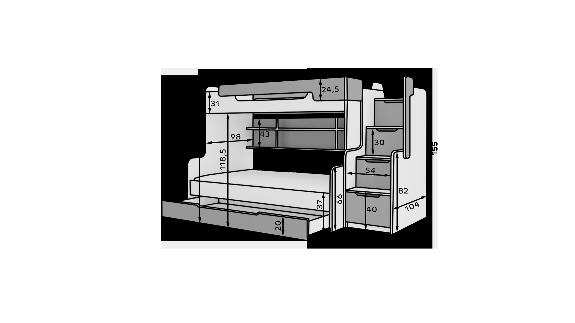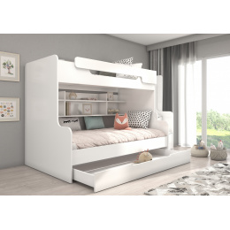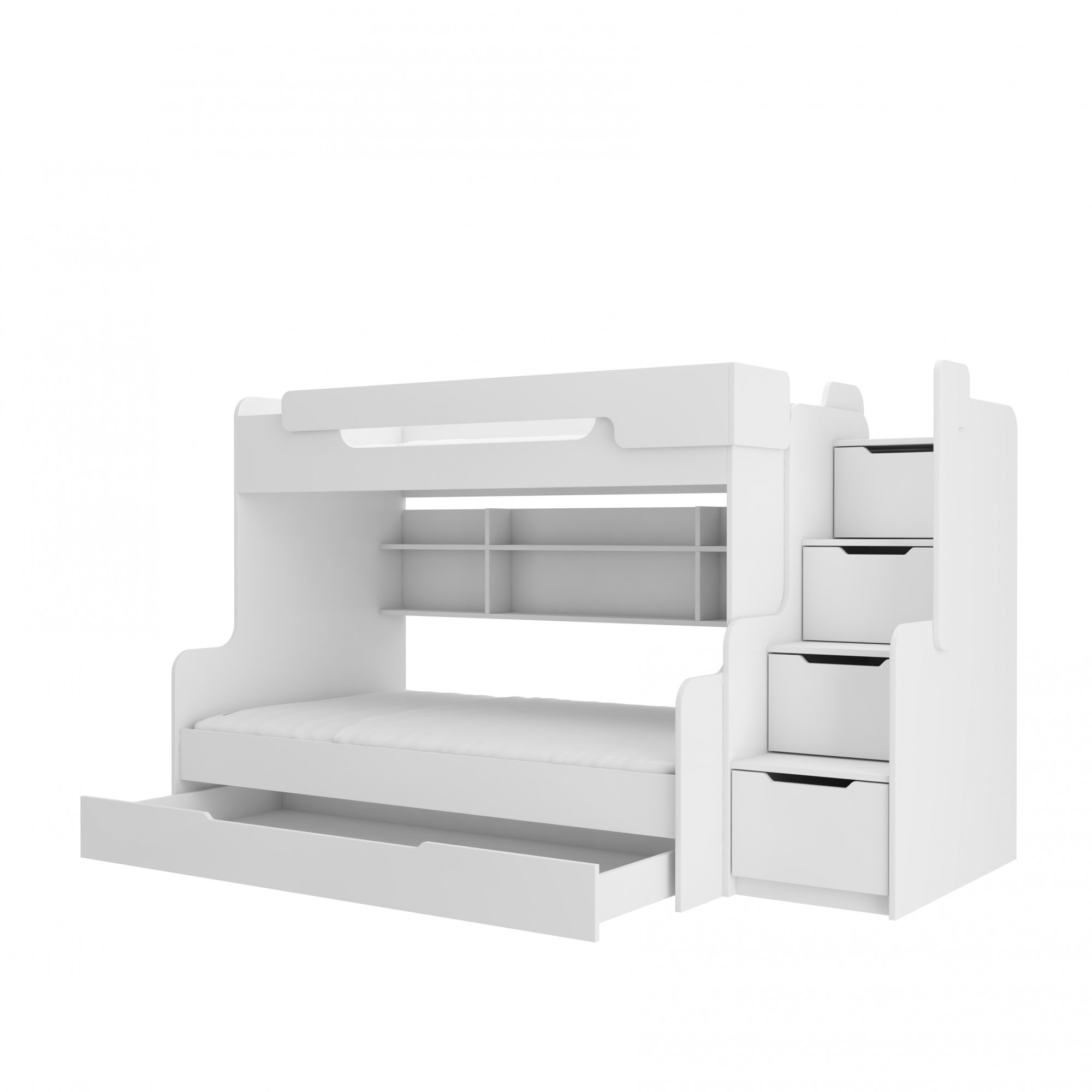 Patrová 3lůžková postel HARELL je skvělý nápad na úsporu místa v malém dětském pokoji. Kromě místa na spaní je postel se schody také ideálním řešením pro úložný prostor. Pod každým schodem se nacházejí úložné prostory, které poskytují další místo na knihy nebo hračky. Spolu s postelí obdržíte sadu matrací: pěnovou matraci 200x90 cm a bonelovou matraci 200x120 cm.