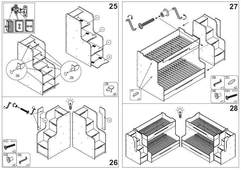 Patrová 3lůžková postel HARELL je skvělý nápad na úsporu místa v malém dětském pokoji. Kromě místa na spaní je postel se schody také ideálním řešením pro úložný prostor. Pod každým schodem se nacházejí úložné prostory, které poskytují další místo na knihy nebo hračky. Matrace nejsou součástí postele.