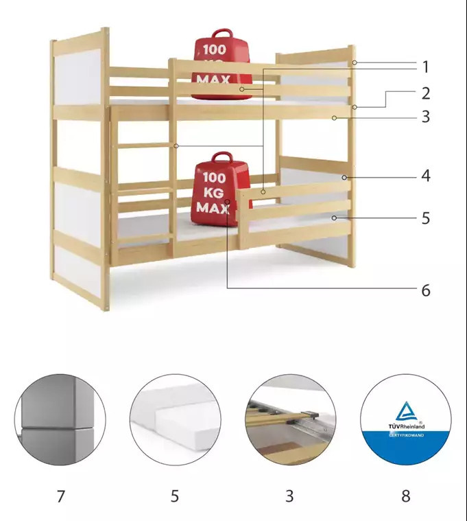 Dětská patrová postel RICO 90x200 cm, bez matrace, Přírodní/Bílá