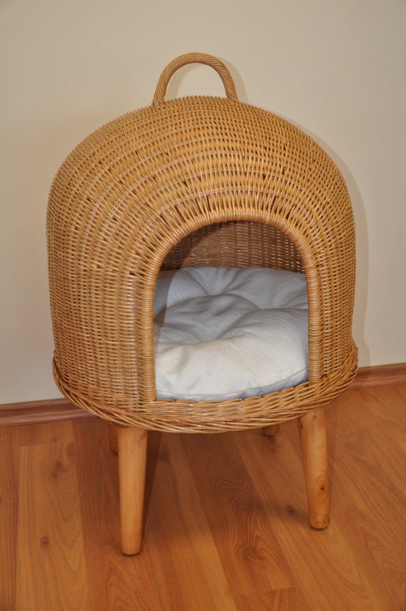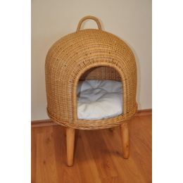 Pelíšek pro kočku je vyrobený z přírodního ratanu v kombinaci s mahagonovým dřevem. | Krásný a bytelný pelíšek pro vašeho domácího mazlíčka. Základem je pevná překližková deska na jijímž základě je ručně vypletena stříška z přírodního ratanu. Nohy jsou vyrobeny z masivního mahagonového dřeva. Barva ratanové konstrukce je medová. Celková velikost je 45 x 45 x výška 68 cm. Velikost vhodového otvoru je 21x23 cm. Výška polštáře od země je 33 cm. Průměr kruhového vnitřího polštáře je 43 cm.