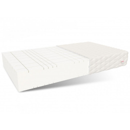 GOYA MAX PLUS je vysoce kvalitní oboustranná matrace. Díky použití řady podélných a příčných řezů je matrace rozdělena do 7 zón. To vede k výraznému zvýšení plasticity a poskytuje vynikající oporu páteře. Pěna má nestejnoměrnou buněčnou strukturu, díky níž dosahuje lepší opory těla, pohodlí a parametrů pružnosti. Zajišťuje, že se matrace dokonale přizpůsobí tvaru těla, a přitom zůstává velmi lehká. Tento materiál je mimořádně trvanlivý a odolný proti deformaci. Pórovitá struktura zajišťuje dokonalou cirkulaci vzduchu, která zabraňuje vzniku hub a plísní. Rovina, obrysově vyřezaná do formy mřížky, se vyznačuje svými ortopedickými vlastnostmi. Specifikace: tvrdost: H4 hard, tloušťka: 26 cm. Složení: HR pěna: 25 cm, Potah: 1 cm.