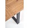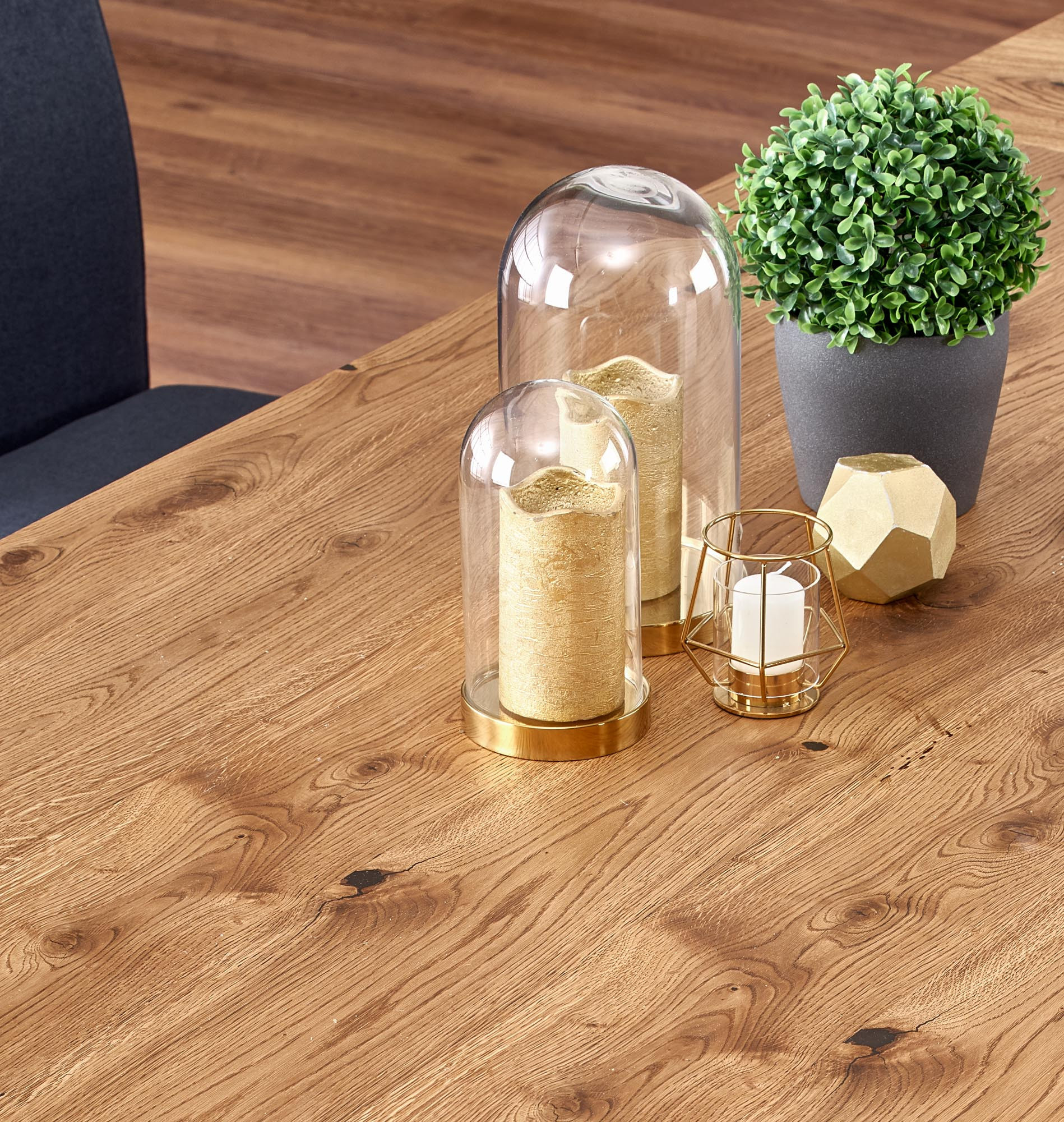 rozkládací stůl, rozměry: 160÷250/90/76 cm, materiál: deska - dýhovaná deska, hrany z masivního dřeva, nohy - práškově lakovaná ocel, barva: deska - světlý dub, nohy - černá