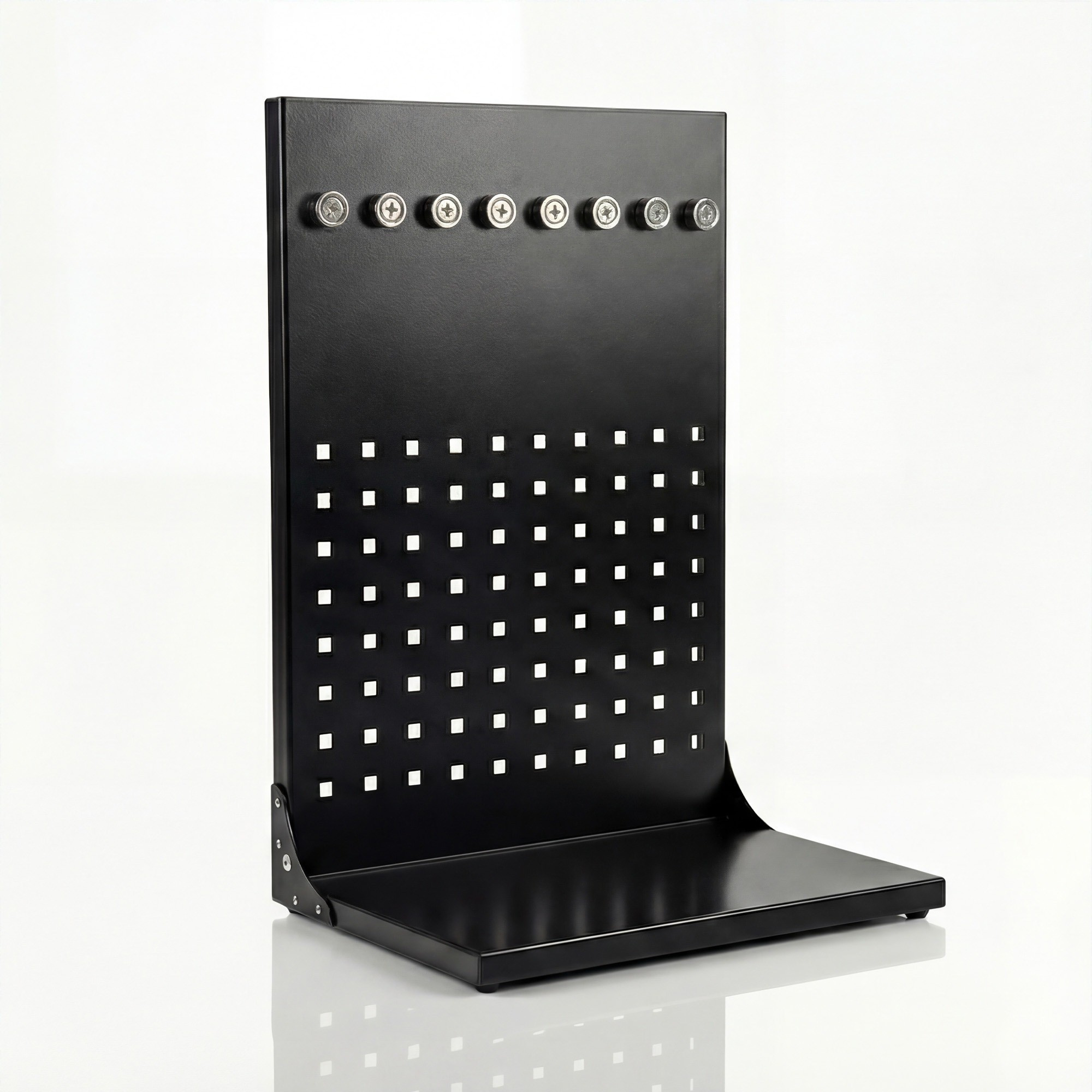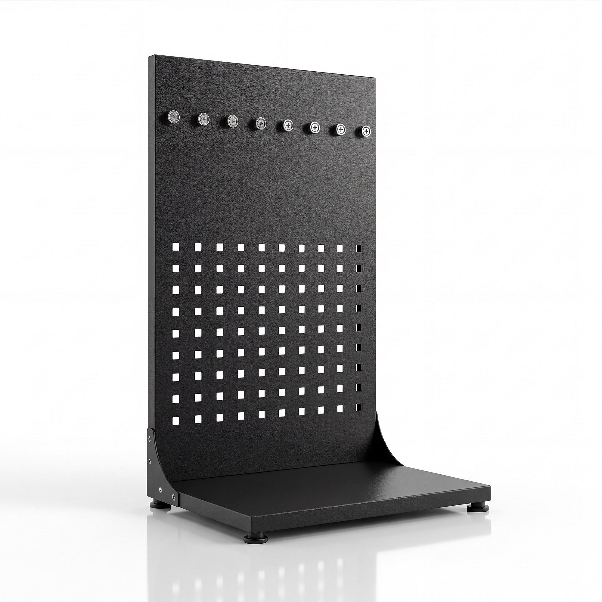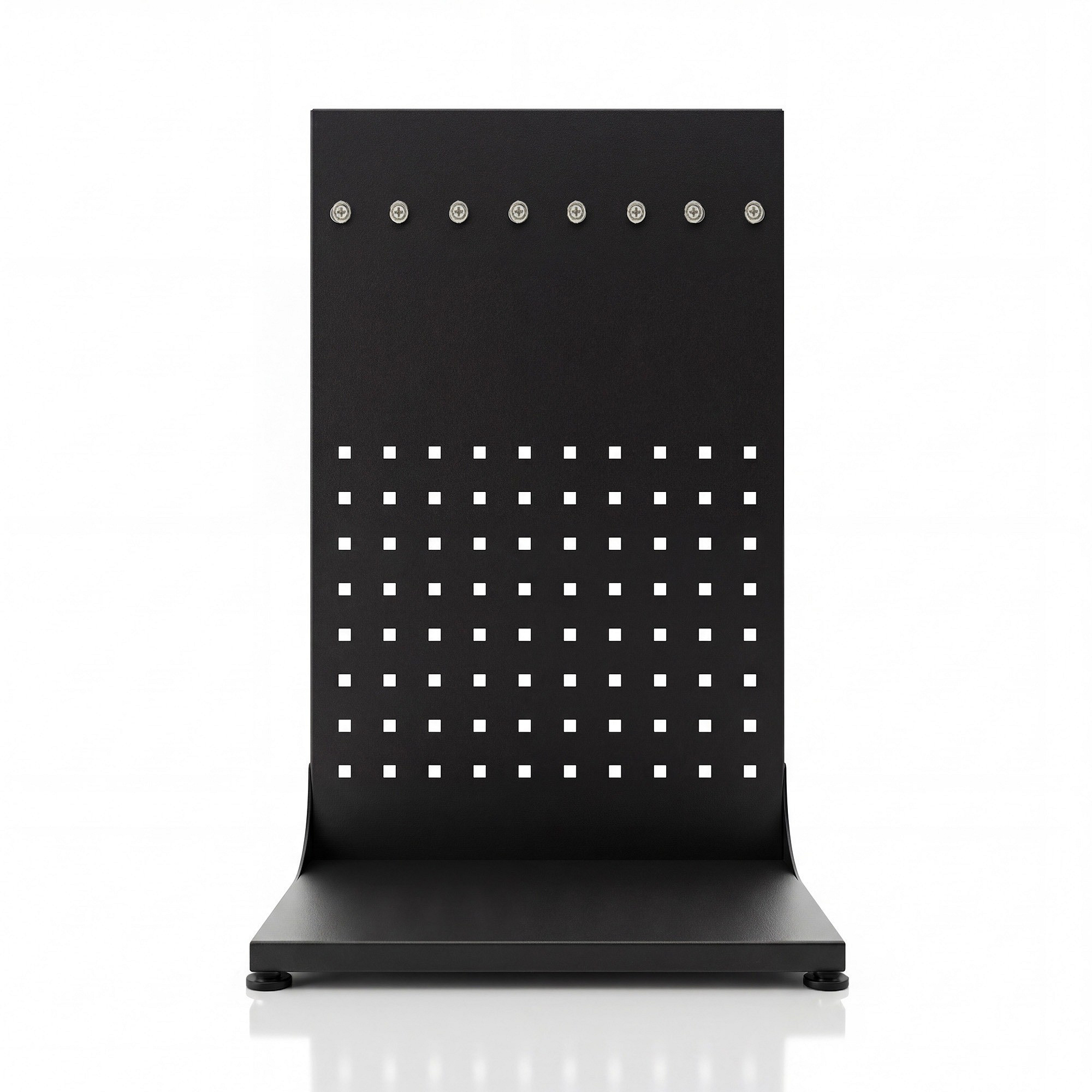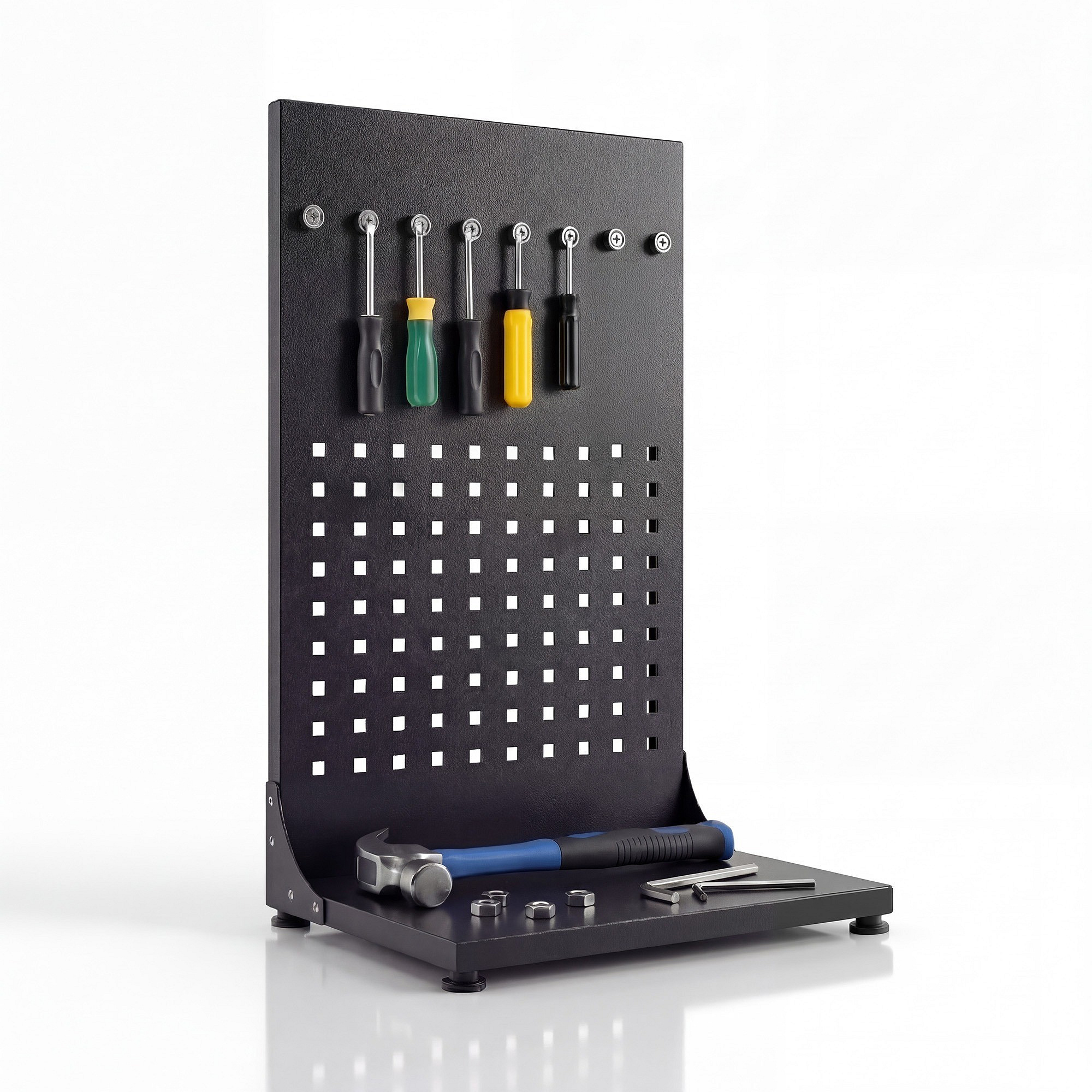 Už žádné složité montáže a vrtání do zdi! Naše děrovaná tabule je samostatně stojící, což znamená, že ji můžete umístit kamkoliv potřebujete – na pracovní stůl, do garáže, nebo dokonce i do skříně. Díky nastavitelným nožičkám ji snadno vyrovnáte i na nerovném povrchu.