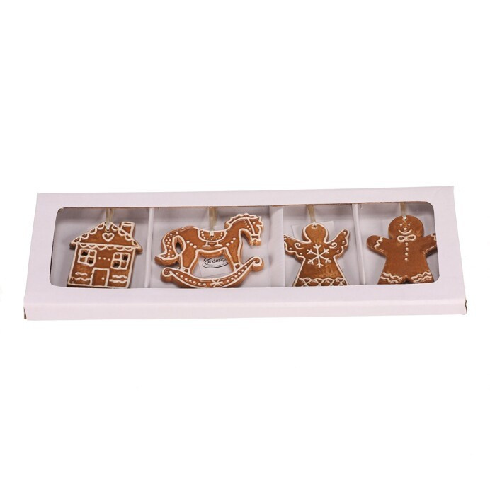Sada 4 různých keramických perníkových ozdob přinese do vašeho domova tu pravou vánoční atmosféru. Andílek, domeček, koník a panáček vypadají jako čerstvě upečené dobroty, zdobené sladkou bílou polevou. Každá ozdoba má stužku na pověšení, takže skvěle doplní výzdobu vánočního stromku, nebo může zdobit stěny, dveře či závěsy.