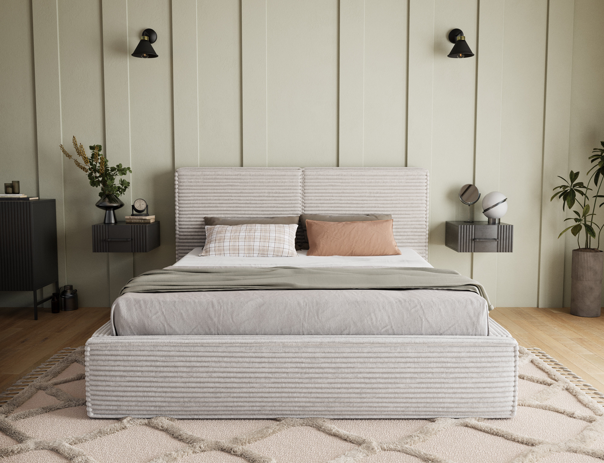 Postel do ložnice Pesillo kombinuje eleganci a funkčnost v moderním designu. Model je k dispozici ve třech velikostních variantách: 140x200 cm, 160x200 cm a 180x200 cm, což vám umožní dokonale přizpůsobit postel rozměrům vaší ložnice a vašim individuálním potřebám. Celková výška postele je 103 cm, zatímco její hloubka měří 220 cm. Šířka závisí na vybraném modelu a je 158 cm, 178 cm nebo 198 cm. Pěnová výplň T2130 zajišťuje pohodlí a odolnost, zatímco robustní černé plastové nohy nábytku poskytují stabilitu a elegantní vzhled. Postel Pesillo je vybavena praktickým úložným prostorem na lůžkoviny, což umožňuje efektivní využití prostoru a snadnou organizaci. Navržen v moderním stylu, dokonale zapadá do současných trendů interiérového designu, vytváří útulnou a elegantní atmosféru ideální pro relaxaci.