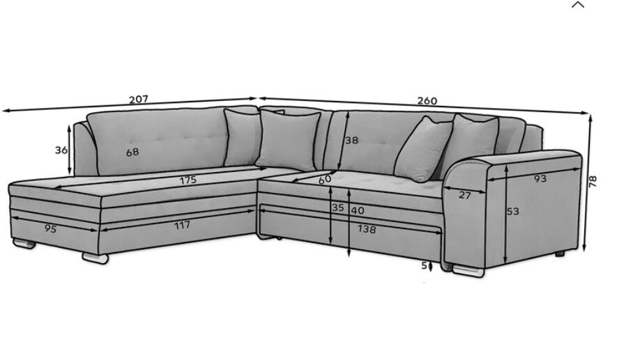 Pieretta je vyrobena z vysoce kvalitních materiálů, které zajišťují dlouhou životnost a maximální pohodlí. Široký sedák je vyplněn kombinací vlnité pružiny a pěny T30, což poskytuje optimální podporu a komfort při sezení i ležení. Rozměry pohovky 260 x 205 x 80 cm zajišťují dostatek prostoru pro celou rodinu.