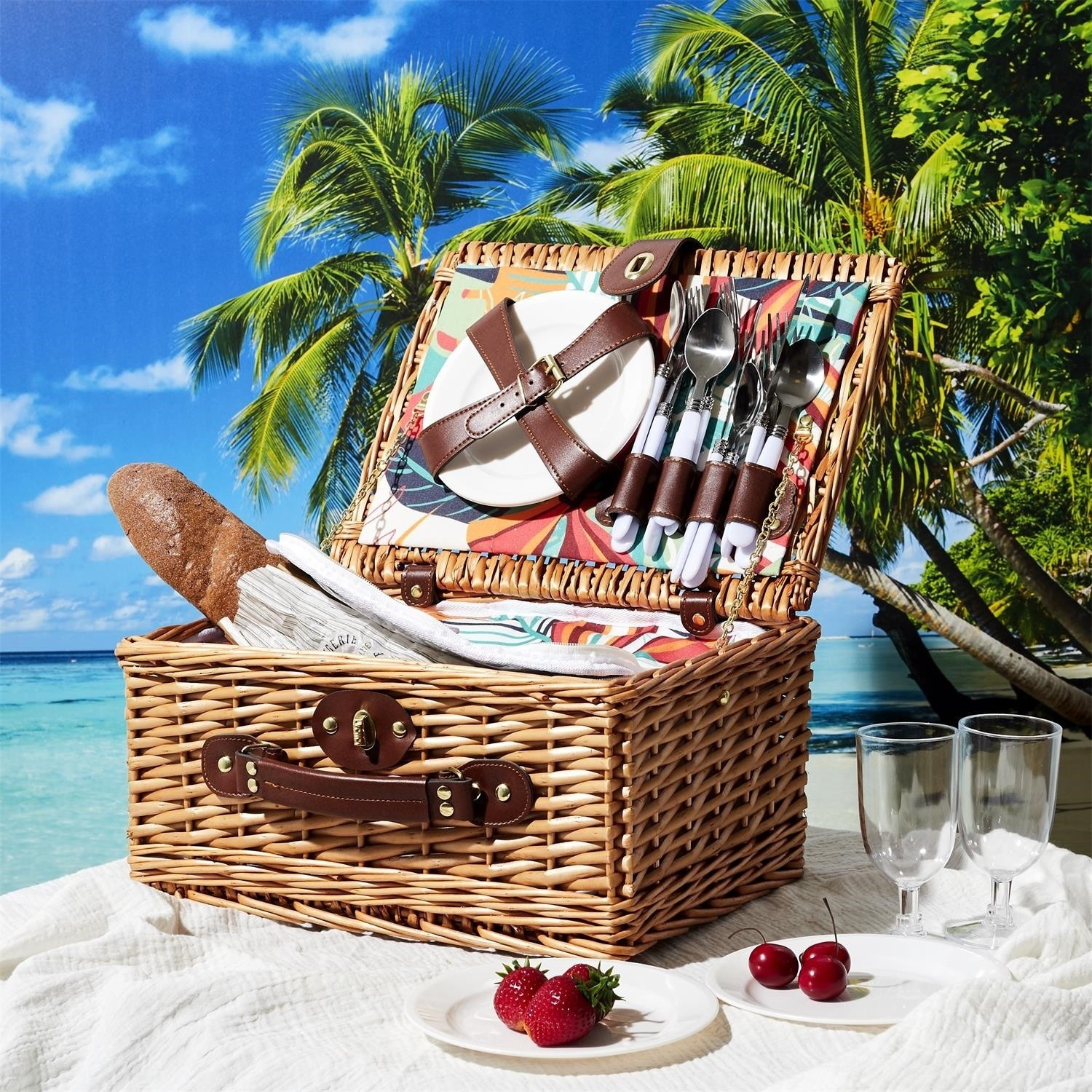 Piknikový koš Exotic pro 4 osoby s vybavením je ideální volbou pro letní výlety na čerstvém vzduchu. Vyrobený z vysoce kvalitních materiálů, zajišťuje pohodlí a funkčnost. Koš obsahuje kompletní sadu nezbytných doplňků pro čtyři osoby, jako jsou talíře, příbory a sklenice, díky čemuž bude každá chvíle strávená na pikniku výjimečná. Jeho elegantní vzhled a prostornost z něj činí vynikající volbu pro rodinné výlety a setkání s přáteli. Hmotnost (g): 1600 Materiál: Proutěné dřevo, PS, polyester