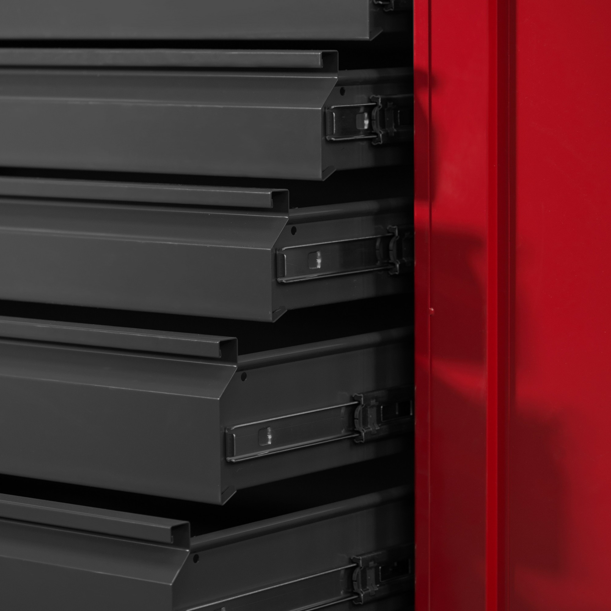 - 7 zásuvek s nosností až 40 kg každá: Ideální pro uskladnění menšího nářadí, šroubů, matic a dalšího příslušenství. Zásuvky jsou navrženy tak, aby se snadno otevíraly a zavíraly i při plném zatížení.