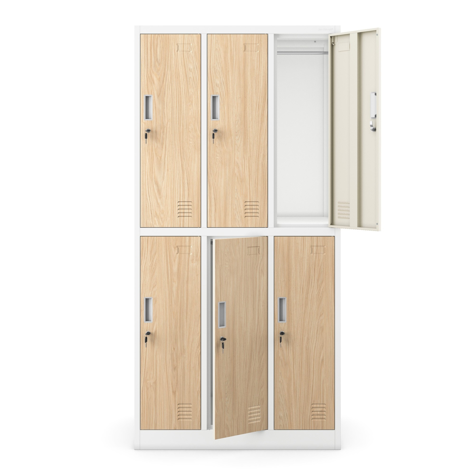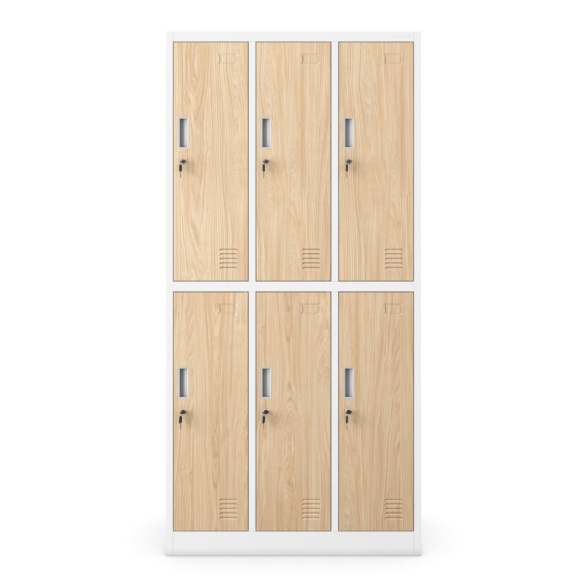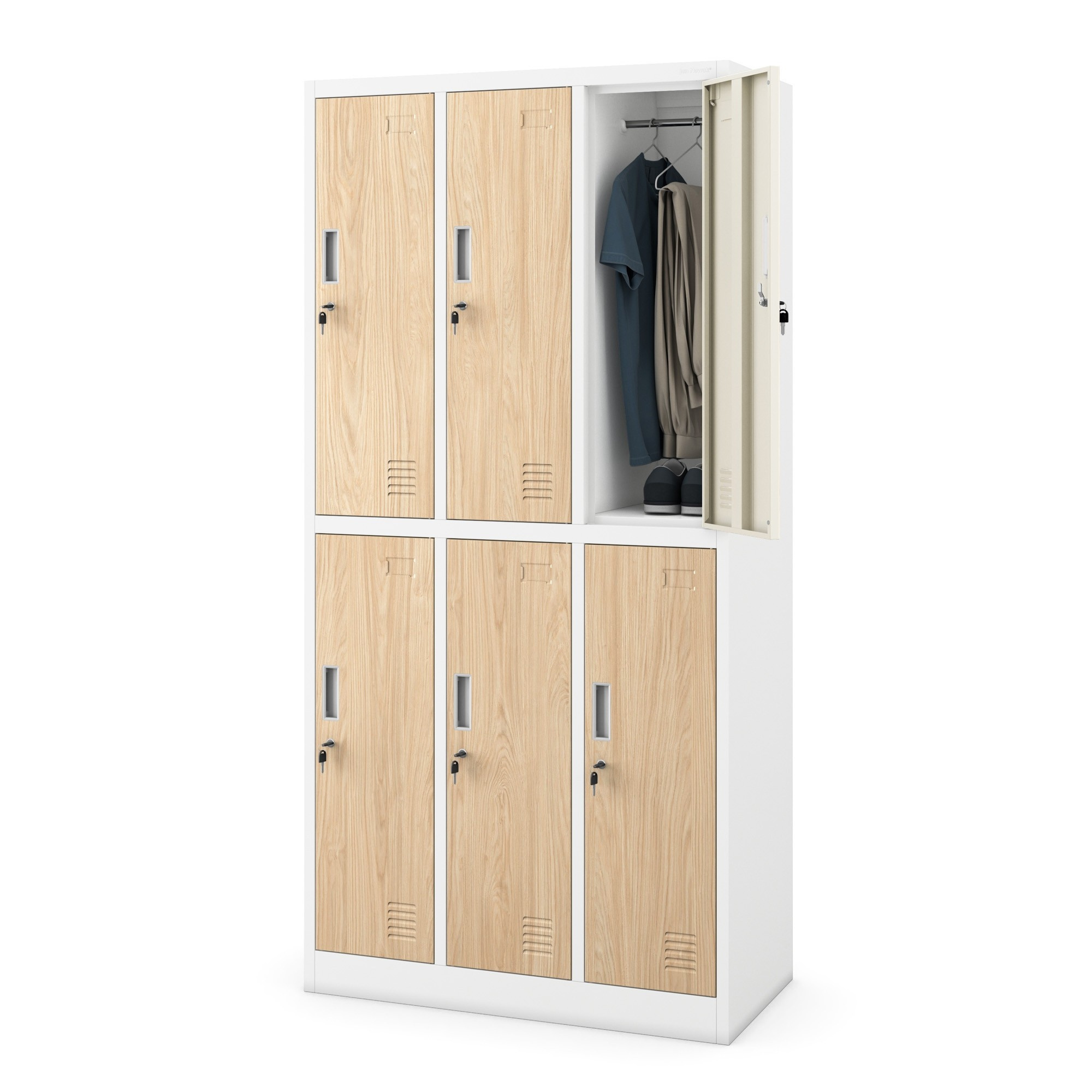 Plechová uzamykatelná šatní skříň s 6 boxy IGOR, 900 x 1850 x 450 mm, Eco Design: bílá/ dub sonoma