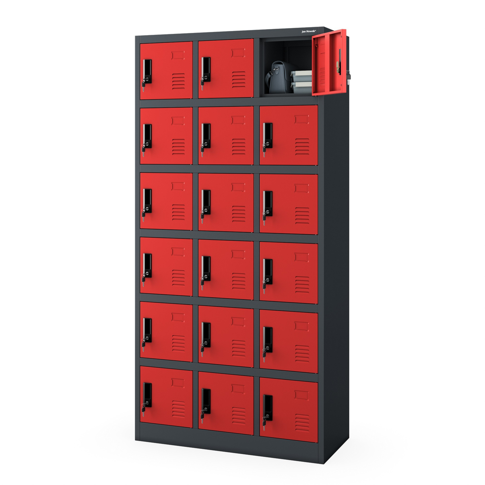 - Kompaktní rozměry, maximální úložný prostor: I přes svou šířku pouhých 90 cm nabízí skříň KAROL až 18 uzamykatelných schránek. Ideální pro prostory s omezeným místem.