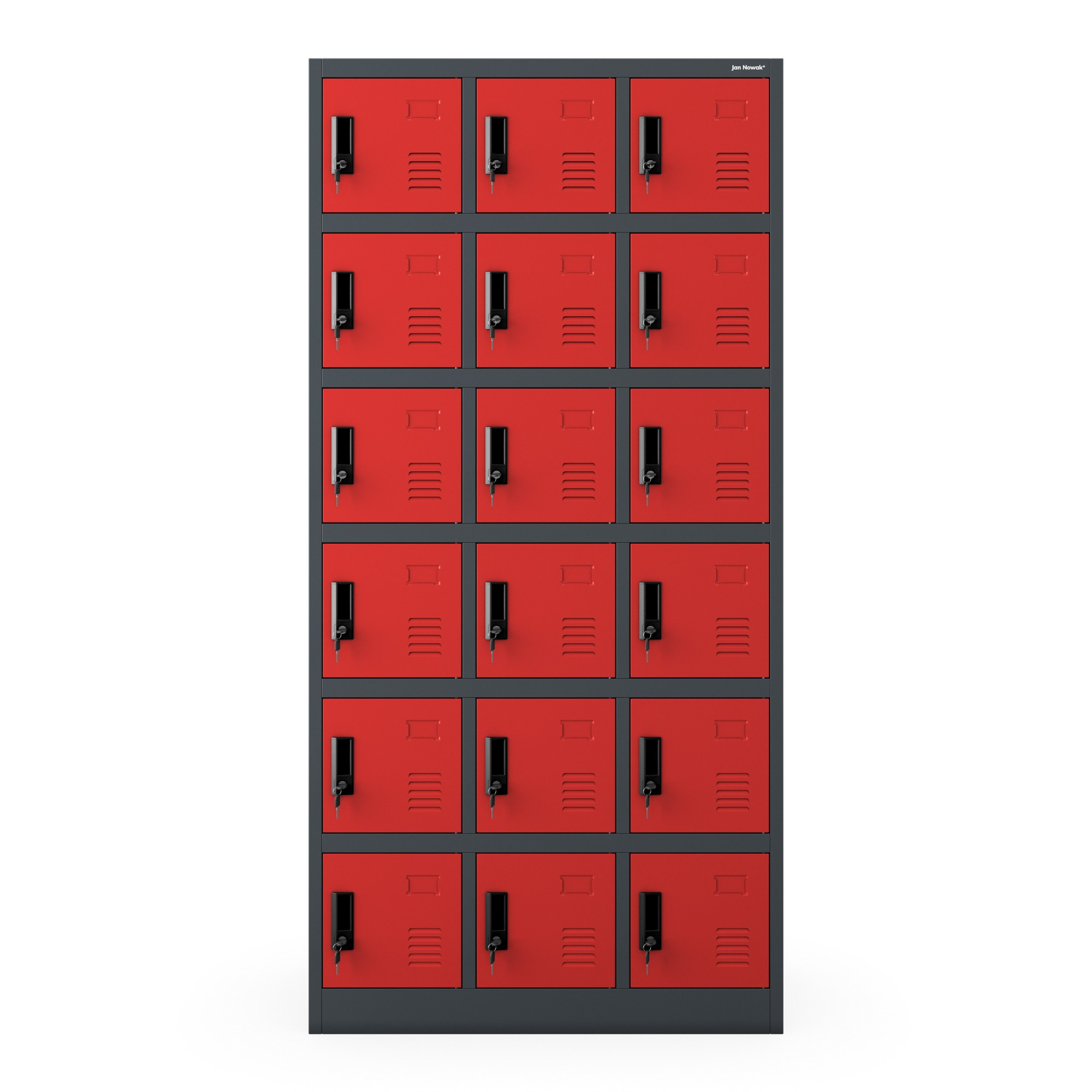 Díky 18 uzamykatelným schránkám nabízí sociální skříň KAROL dostatek úložného prostoru pro všechny vaše potřeby. Každá schránka je vybavena vizitkářem, takže si můžete snadno označit, komu patří. Ventilační otvory zajišťují optimální cirkulaci vzduchu a zabraňují vzniku vlhkosti a zápachu.