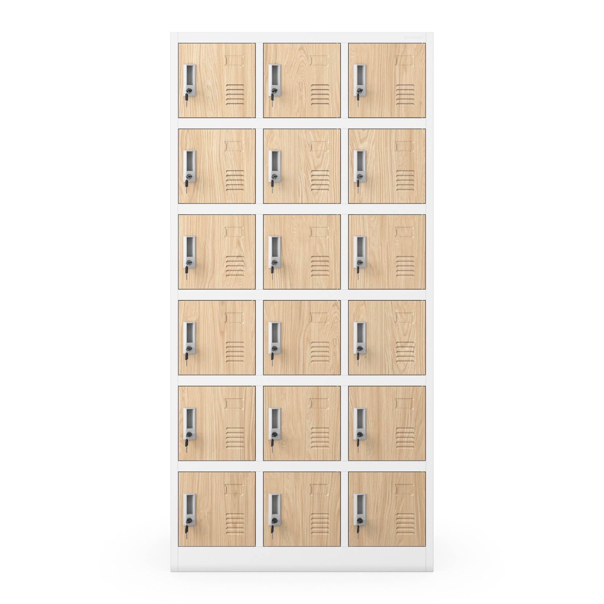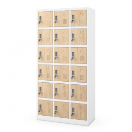 Skříň KAROL nabízí 18 samostatných přihrádek, které poskytují dostatek prostoru pro uložení oblečení, obuvi, batohů, tašek a osobních věcí. Každá přihrádka je navržena tak, aby maximalizovala využití dostupného prostoru. Díky tomu je skříň KAROL ideální pro šatny s omezeným prostorem, kde je potřeba efektivně uspořádat věci více osob.