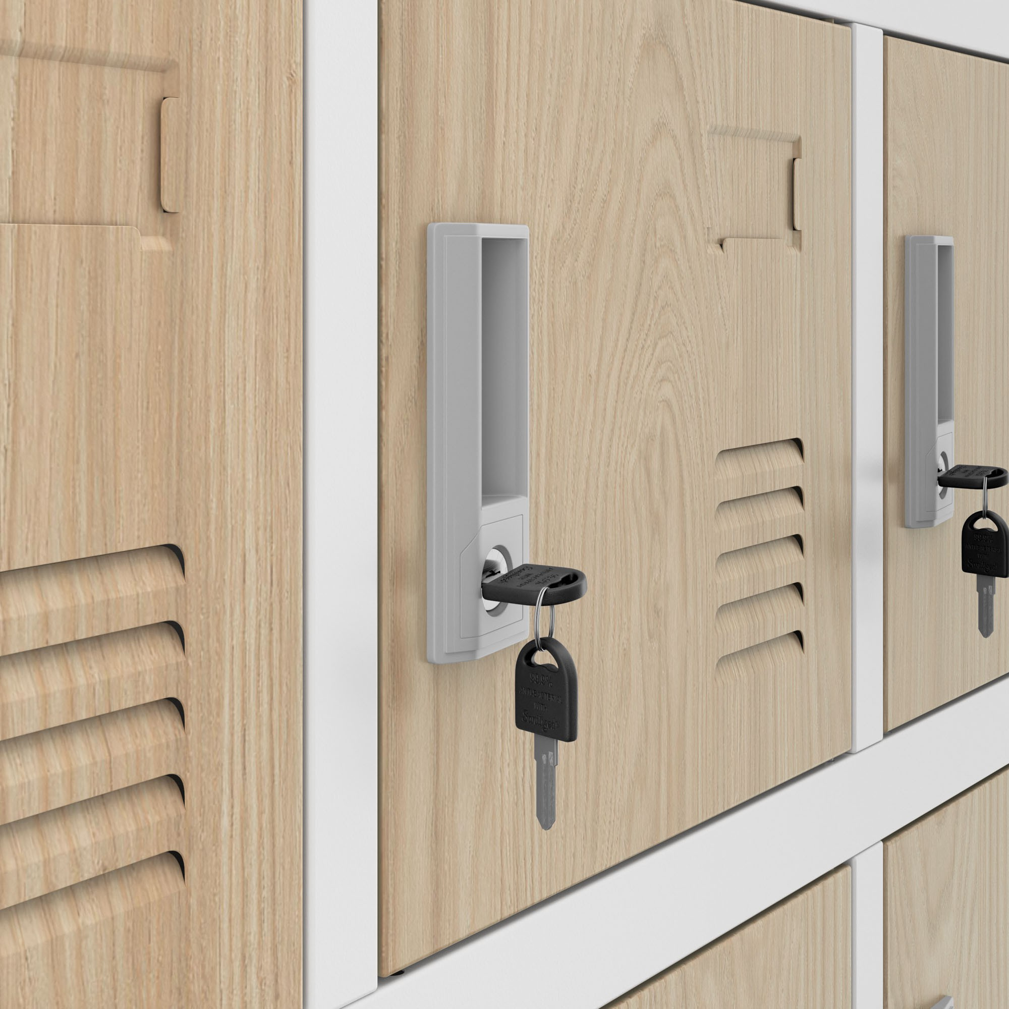 - Univerzální klíč: Umožňuje otevření všech přihrádek v případě ztráty klíče.