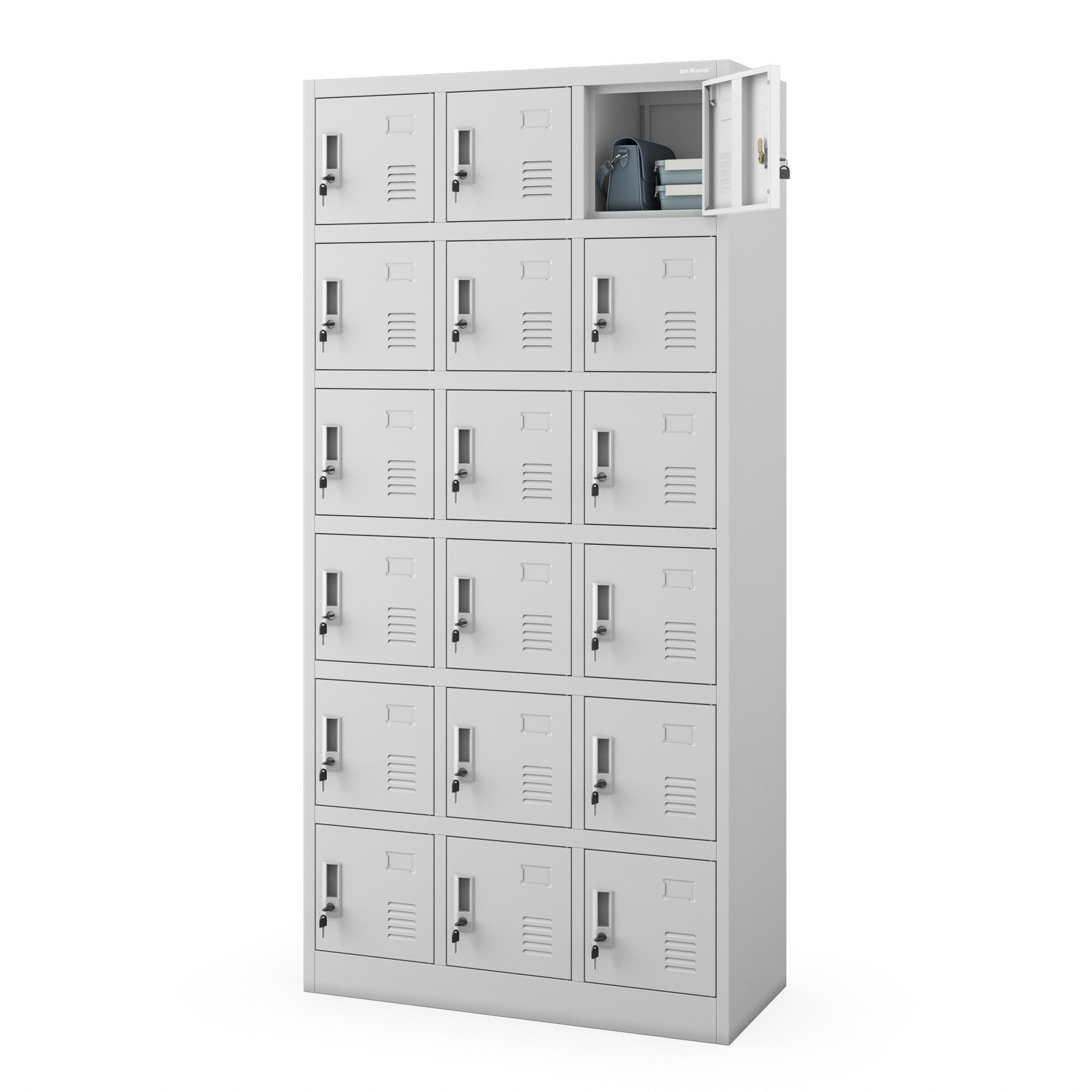 18 samostatných přihrádek umožňuje ukládání oblečení, obuvi, batohů a osobních předmětů. Tato struktura zajišťuje efektivní využití dostupného místa a pohodlné používání více lidmi. Organizace se stává mnohem efektivnější.
