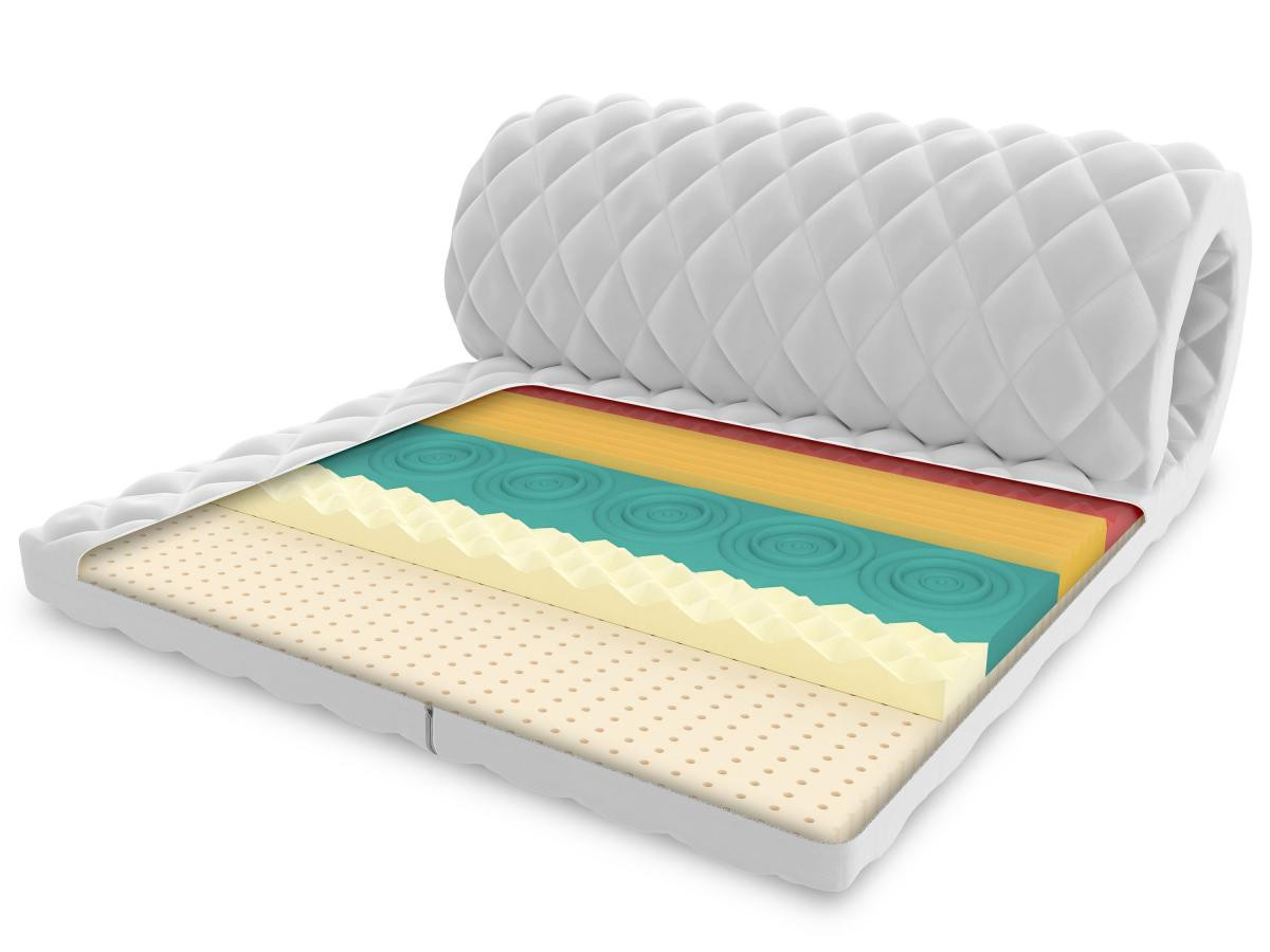 Topper je vyroben z latexové pěny. Latex se přizpůsobuje tvaru těla a zajišťuje účinnou ventilaci během spánku. Při každém otočení nebo pohybu se latexová vrstva stlačuje a rozpíná, čímž vznikají vnitřní kanálky, kterými se přenáší vzduch. Kromě toho je to velmi hygienický výrobek. Má široké spektrum antialergických vlastností díky kterým se omeze růstu plísní, roztočů a hub. Latex je velmi pružný, trvanlivý a odolný proti opotřebení, takže jej lze používat po mnoho let bez viditelných změn jeho struktury a vlastností. Druhou vrstvou topperu je profilovaná 7mi-zónová vysoce pružná pěna HR H30. Profilovaný povrch rozděluje matraci do 7 zón, díky čemuž se pěna dokonale přizpůsobí tvaru těla. Má nestejnoměrnou buněčnou strukturu a proto dosahuje lepších parametrů pohodlí a pružnosti. Tento materiál se vyznačuje mimořádnou trvanlivostí a odolností proti deformaci. Navíc získává svůj původní tvar dvakrát rychleji než standardní polyuretanová pěna. To znamená, že profilovaná HR pěna rychleji reaguje na změny polohy těla během spánku. Antialergický prošívaný potah Premium 200 g/m² s membránovou strukturou je vyroben z nejkvalitnějších prvotřídních hypoalergenních materiálů, které zajišťují výjimečnou měkkost, svěžest, mimořádné pohodlí a spokojenost s jeho používáním. Zabraňuje pronikání nečistot do matrace, chrání před pronikáním bakterií, hub, plísní a roztočů. Potah je opatřen všitým zipem, který umožňuje jeho snadné sejmutí pro praní.