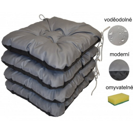 Set 4 kusů podsedáků vyrobených z voděodolné látky. | Velikost sedáku je 38x38 cm. Sedák je plněný molitanovou drtí, která se nesesedne a zaručí příjemné sezení. Sedák je vyrobený z vrchní strany z voděodolné látky Oxford v šedé barvě. Spodní strana sedáku je vyrobena z černé voděodolné látky.