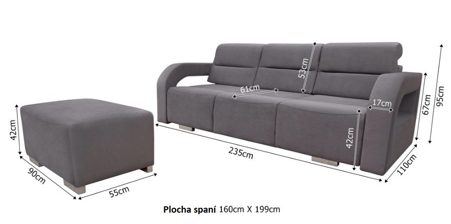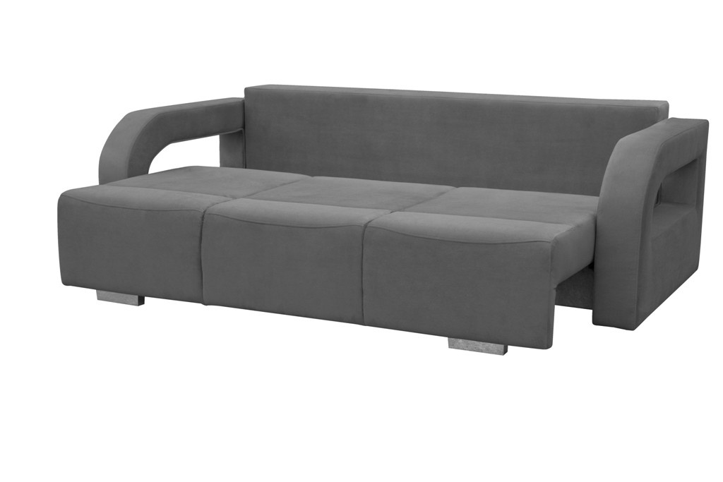 Modernistická pohovka ALISS je stylově volně stojící a lze ji kombinovat s taburetem ALISS, který je součástí sady. Taburet lze použít jako další sedací plochu i jako podnožku - při odpočinku na pohovce si na něj budete moci položit nohy, což vám umožní plně relaxovat nebo si dokonce zdřímnout po náročném dni. Třímístná pohovka ALISS je nábytek vybavený automatickým rozkládáním, které umožňuje rychlou a efektivní manipulaci. Pohovka ALISS je umístěna na dřevěném rámu - nábytek zůstane pevný a stabilní i při každodenním používání. Volně stojící kus nábytku je čalouněný látkou, jejíž barvy si můžete vybrat z široké nabídky barev. Pohovka s bočnicemi zaujme stylovým prošíváním a originálními výřezy pod područkami.