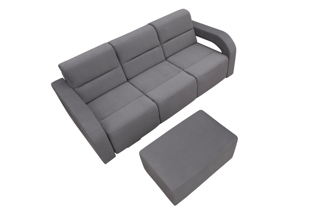 Modernistická pohovka ALISS je stylově volně stojící a lze ji kombinovat s taburetem ALISS, který je součástí sady. Taburet lze použít jako další sedací plochu i jako podnožku - při odpočinku na pohovce si na něj budete moci položit nohy, což vám umožní plně relaxovat nebo si dokonce zdřímnout po náročném dni. Třímístná pohovka ALISS je nábytek vybavený automatickým rozkládáním, které umožňuje rychlou a efektivní manipulaci. Pohovka ALISS je umístěna na dřevěném rámu - nábytek zůstane pevný a stabilní i při každodenním používání. Volně stojící kus nábytku je čalouněný látkou, jejíž barvy si můžete vybrat z široké nabídky barev. Pohovka s bočnicemi zaujme stylovým prošíváním a originálními výřezy pod područkami.