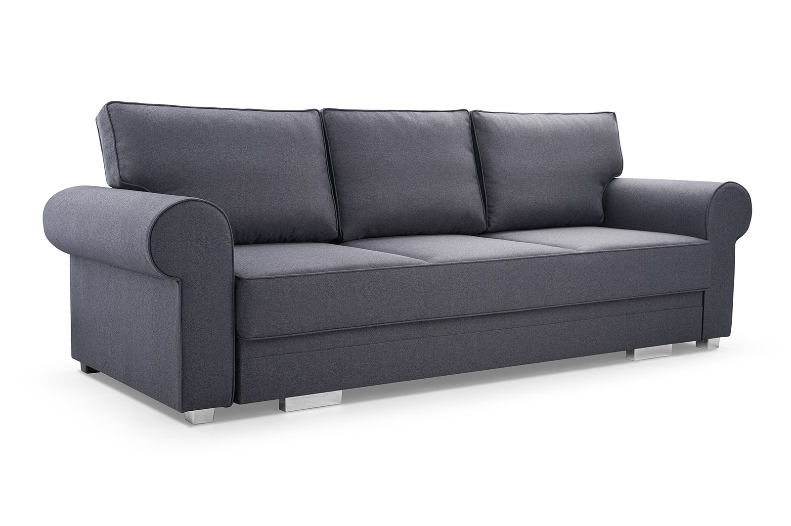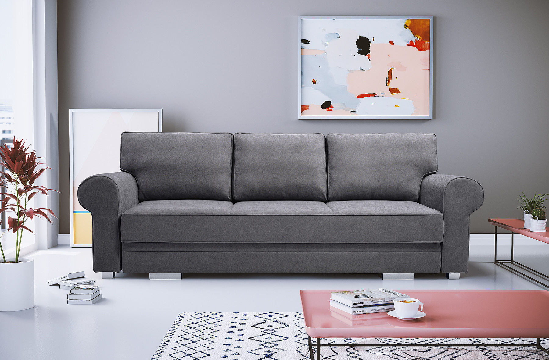 BUKIET je moderně navržená třímístná rozkládací pohovka. Nábytek je čalouněný látkou, jejíž barvy lze vybrat ze vzorníku barev dostupného na webových stránkách. Stylová pohovka je kus nábytku vybavený automatickou rozkládací pomůckou, díky níž ji bude možné bez větších problémů rychle přeměnit na lůžko. Pohovka BUKIET je volně stojící kus nábytku, a proto je její opěradlo také čalouněné - takové řešení umožňuje umístit pohovku i do centrální části obývacího pokoje. Nábytek s moderním designem s bočnicemi je umístěn na chromových nožkách, které mu dodávají zajímavý charakter. Model BUKIET je umístěn na dřevěném rámu a sedák a opěrák jsou zakončeny vlnitými pružinami, které pomáhají udržovat správnou pružnost, takže ani přes časté používání nedochází k nevzhledným deformacím. Pohovka BUKIET s klasickým tvarem zaujme na první pohled svými mírně zaoblenými boky a polštáři umístěnými na opěradle, které zajistí pohodlí a komfort i při mnohahodinovém sezení.