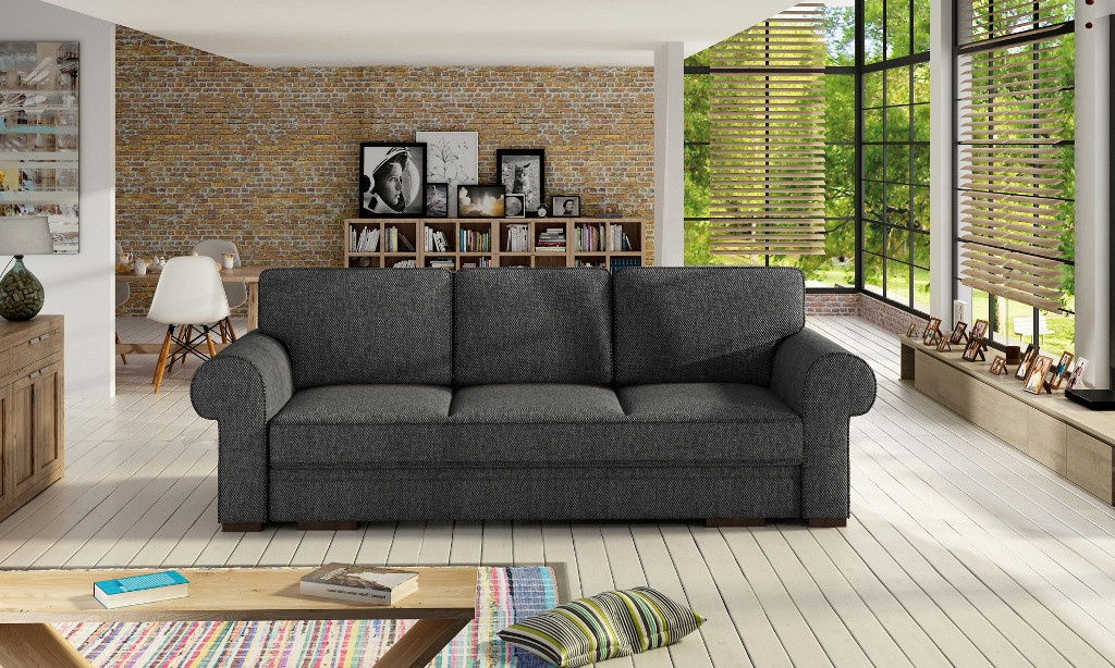 BUKIET je moderně navržená třímístná rozkládací pohovka. Nábytek je čalouněný látkou, jejíž barvy lze vybrat ze vzorníku barev dostupného na webových stránkách. Stylová pohovka je kus nábytku vybavený automatickou rozkládací pomůckou, díky níž ji bude možné bez větších problémů rychle přeměnit na lůžko. Pohovka BUKIET je volně stojící kus nábytku, a proto je její opěradlo také čalouněné - takové řešení umožňuje umístit pohovku i do centrální části obývacího pokoje. Nábytek s moderním designem s bočnicemi je umístěn na chromových nožkách, které mu dodávají zajímavý charakter. Model BUKIET je umístěn na dřevěném rámu a sedák a opěrák jsou zakončeny vlnitými pružinami, které pomáhají udržovat správnou pružnost, takže ani přes časté používání nedochází k nevzhledným deformacím. Pohovka BUKIET s klasickým tvarem zaujme na první pohled svými mírně zaoblenými boky a polštáři umístěnými na opěradle, které zajistí pohodlí a komfort i při mnohahodinovém sezení.