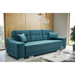 Modernistická pohovka CYPIS je masivní třímístná pohovka, která bude atraktivním a zároveň praktickým kusem nábytku do obývacího pokoje nebo obývacího pokoje. Stylová pohovka s bočnicemi je kus nábytku s funkcí spaní, který zaručuje pohodlný a bezpečný spánek. Tento kus nábytku, dokončený ve skandinávském dekoru, osloví i ty nejnáročnější uživatele - vypadá esteticky a zároveň poskytuje pohodlí a komfort i při dlouhém sezení. Rozkládací pohovka CYPIS je vybavena prostorným úložným prostorem na lůžkoviny a automatickým rozkládáním, díky níž je přeměna pohovky na lůžko rychlá a efektivní. Model CYPIS stojí na masivním dřevěném rámu a celou konstrukci podpírají chromované nohy, které nábytku dodávají moderní charakter. Výplň pohovky tvoří vlnité pružiny, které udržují odpovídající pružnost sedáku a opěráku. Součástí sady s pohovkou jsou dva dekorační polštáře. Volně stojící pohovka CYPIS potěší prošívanými boky i prošíváním viditelným na tvarovaném opěradle. Pohovka do obývacího pokoje může být čalouněná látkou nebo ekokůží v široké škále barev, ze kterých si můžete vybrat.