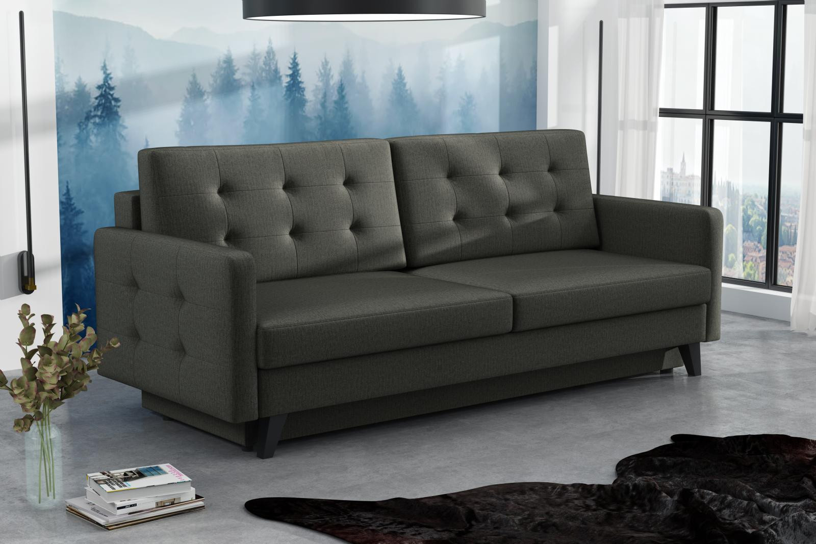 Pohovka Fjord je krásným elegantním kouskem s nádechem RETRO designu a výborně zapadne do každého interiéru. Retro design podtrhují zešikmené dřevěné nohy a látkové knoflíky na opěrce. Pohovka je rozkládací a samozřejmostí je i nepostradatelný úložný prostor. Jednoduchým rozložením pomocí automatu vznikne dostatečně prostorné lůžko k občasnému přespání Vaší návštěvy. Výplň sedáku tvoří vlnité pružiny v kombinaci s pružinami bonell a kvalitní PUR pěnou. Pohovka je celočalouněná, takže ji můžete umístit i do prostoru. Výborně se hodí do obývacího pokoje, do pracovny či pokoje pro hosty. Pohovku nabízíme v několika trendy barvách. Fotografie pohovky v rozkladu jsou pouze ilustrační. Správný barevný odstín je na úvodní fotografii.