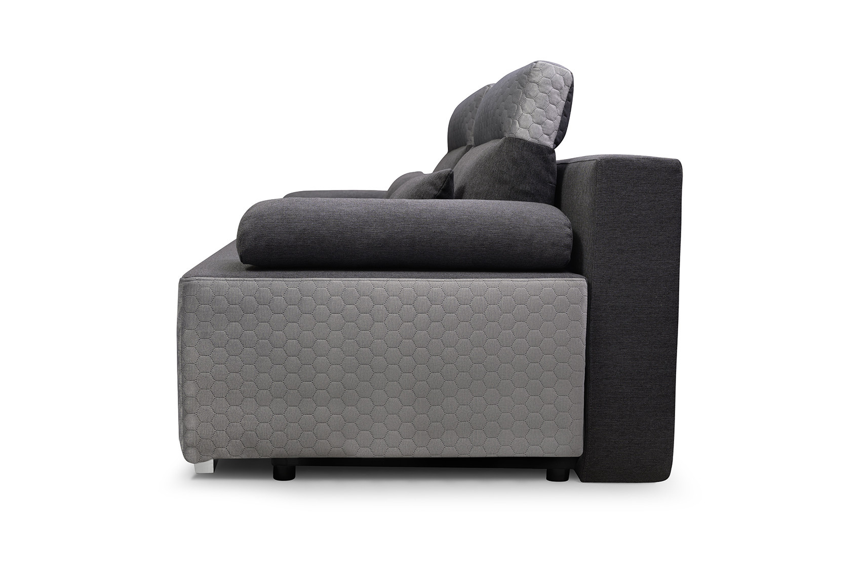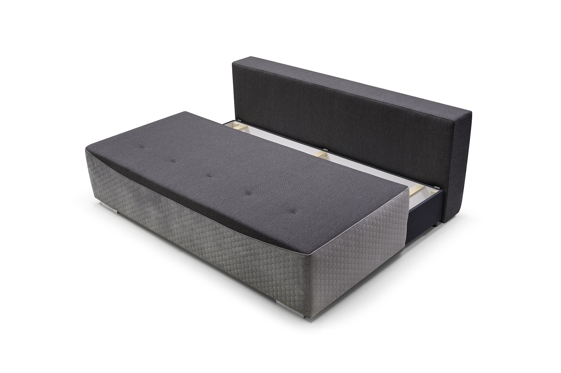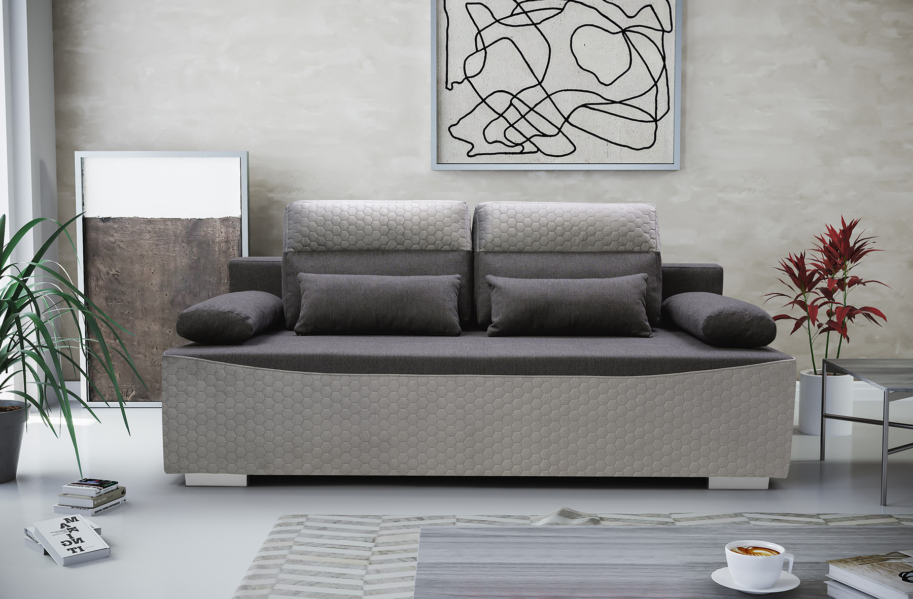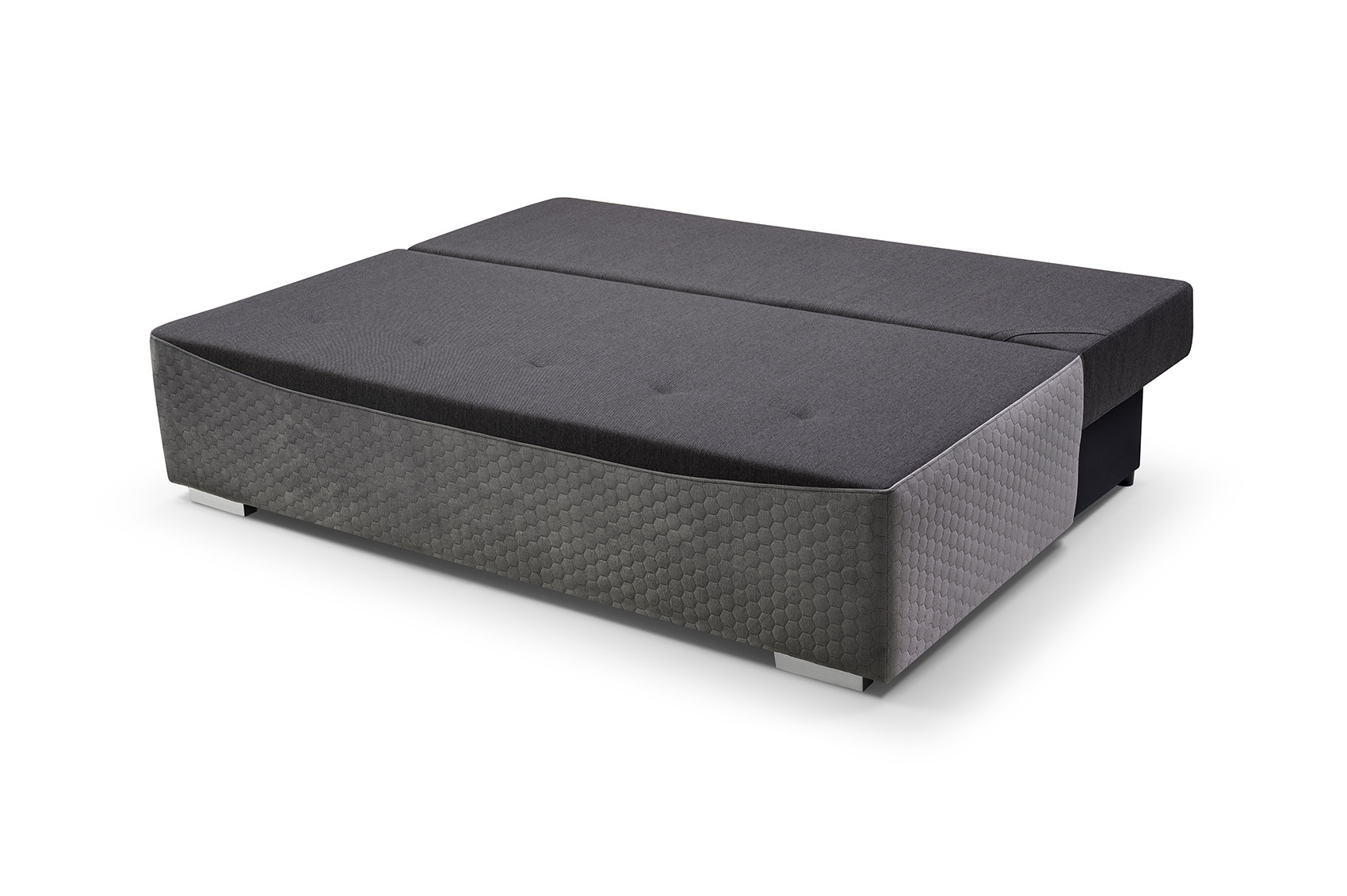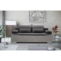 Pohovka GRACJAN má moderní design, který si najde své místo v moderním obývacím pokoji. Pohovka se bude líbit i těm nejnáročnějším uživatelům, protože zaručuje komfort a pohodlí při odpočinku a je estetická - nikdo ji nemine lhostejně. Dvoubarevná pohovka zaujme na první pohled dekorativně prošívanou základnou a horním lemováním polštářů. Celý kus nábytku je navíc doplněn chromovanými nožkami, díky nimž pohovka vypadá neobyčejně originálně. Pohovka je celá čalouněná látkou, jejíž barvy si můžete vybrat ve výběru barev. Dvoumístná pohovka GRACJAN bez bočnic je vybavena dvěma polštáři sloužícími jako područky a dvěma polštáři umístěnými na opěradle, které zaručují pohodlí i při dlouhém sezení. Za zmínku stojí, že pohovka ukrývá prostorný kontejner na lůžkoviny, do kterého se snadno vejdou přikrývky, polštáře a další předměty, které potřebujeme mít po ruce během nočního odpočinku. Rozkládací pohovka s moderní povrchovou úpravou vám poskytne nejen jedinečný odpočinek, ale v obývacím pokoji bude působit i esteticky.