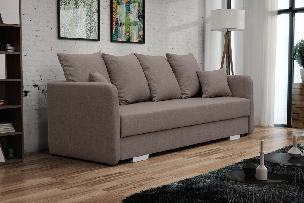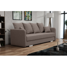 IVET je moderně uspořádaná třímístná pohovka, jejíž opěradlo je zakončeno měkkými polštáři. Tento kus nábytku, který se skvěle hodí do obývacího pokoje nebo obývacího pokoje, stojí na nízkých chromovaných nožkách, které zdůrazňují moderní provedení konstrukce. Pohovka IVET s bočnicemi je vybavena zásobníkem na lůžkoviny pro uložení přikrývek, polštářů nebo peřin a také funkcí spaní, díky níž lze pohovku rozložit. Při výrobě byla stylová pohovka doplněna o automatické rozkládaní, díky níž je velmi snadná i pro ty menší uživatele. Nábytek lze čalounit látkou nebo koženkou v široké škále barev, které jsou k dispozici. Pohovka IVET je volně stojící kus nábytku, takže zadní část pohovky je také čalouněná. Třímístná pohovka do obývacího pokoje je vyplněna vlnitými pružinami, které jí zajistí správnou pružnost - nebude ani příliš tvrdá, ani příliš měkká, takže ani každodenní používání na ní nezpůsobí nevzhledné promáčkliny.