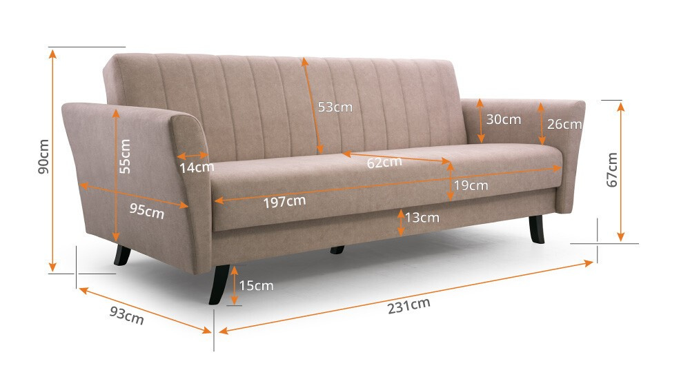 Výška sedu je minimálně 47 cm, což zajišťuje optimální komfort při sezení. Celkové rozměry pohovky jsou 227 x 90 x 93 cm, což z ní dělá ideální nábytek pro menší i větší prostory.