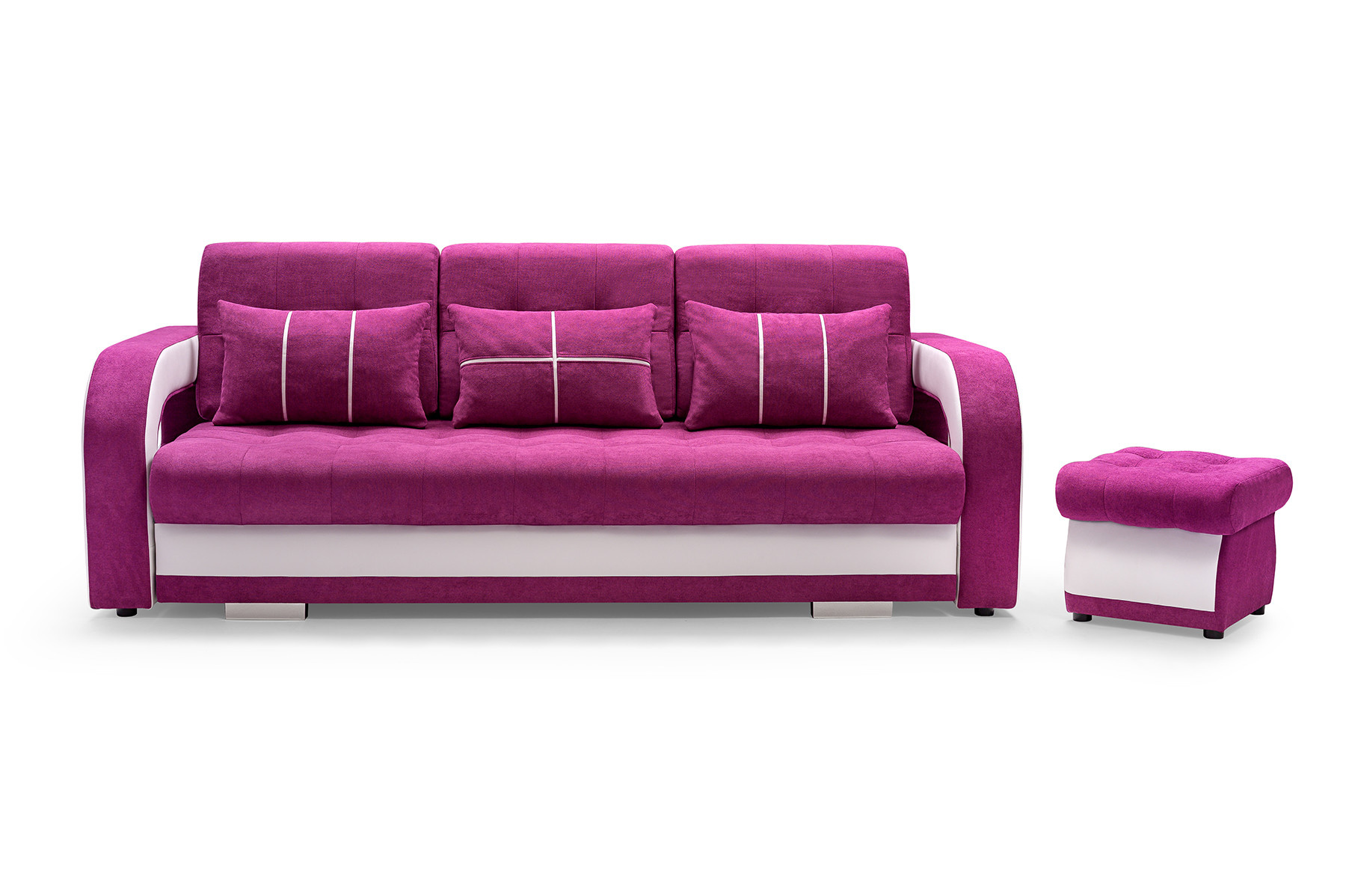 Modernistická pohovka Nina je stylově volně stojící a lze ji kombinovat s taburetem Nina, který je součástí sady. Taburet lze použít jako další sedací plochu i jako podnožku - při odpočinku na pohovce si na něj budete moci položit nohy, což vám umožní plně relaxovat nebo si dokonce zdřímnout po náročném dni. Třímístná pohovka Nina je nábytek vybavený automatickým rozkládáním, které umožňuje rychlou a efektivní manipulaci. Pohovka Nina je umístěna na dřevěném rámu - nábytek zůstane pevný a stabilní i při každodenním používání. Volně stojící kus nábytku je čalouněný látkou, jejíž barvy si můžete vybrat z široké nabídky barev. Pohovka s bočnicemi zaujme stylovým prošíváním a originálními výřezy pod područkami.