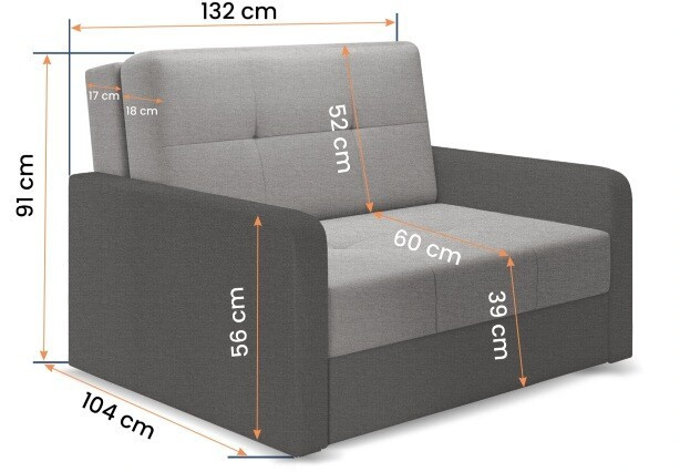 Pohovka je vyrobena z kvalitních materiálů, které zajišťují dlouhou životnost a odolnost. Kombinace potahu a dřeva dodává pohovce elegantní vzhled, který se hodí do jakéhokoli interiéru. Šířka pohovky je 132 cm, maximální výška 91 cm a hloubka 104 cm, což z ní činí kompaktní, ale zároveň prostorný kus nábytku.