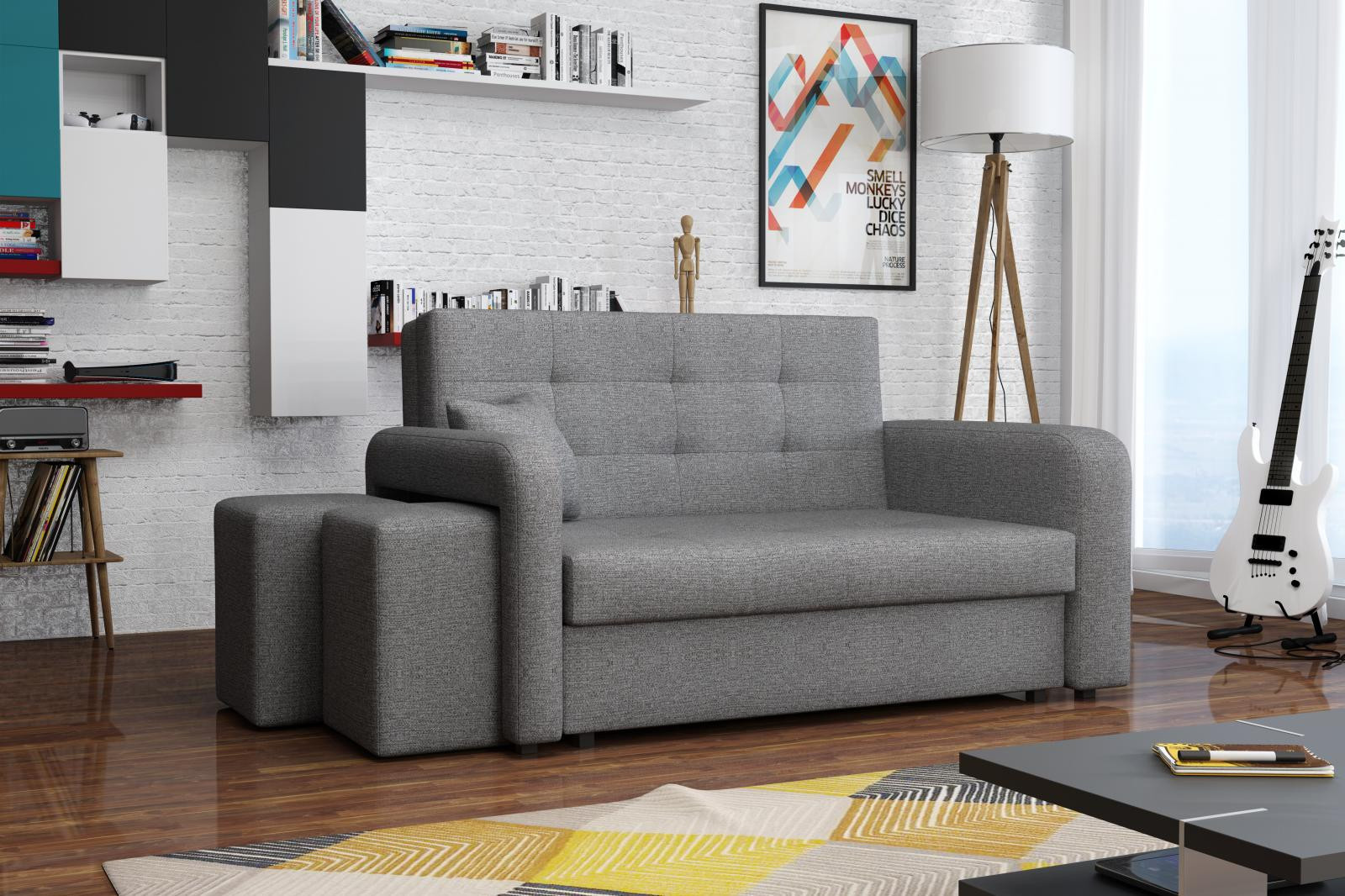 Rozkládací pohovka Vivian je díky svým rozměrům vhodná i do menších pokojů. Své uplatnění najde nejen v obývacím pokoji, ale také v dětském, studentském, nebo hostinském pokoji. Jednoduchým rozložením pomocí automatu, získáte lůžko k příležitostnému přespání Vaší návštěvy. Výplň sedáku tvoří vlnité pružiny v kombinaci s PUR pěnou. Pohovka je potažena kvalitní látkou a nabízíme ji v několika trendy odstínech. Pohovka disponuje i nepostradatelným úložným prostorem, který využijete např. na deku a polštář. V ceně pohovky je 1 dekorační polštář a 2 taburety, které jsou důmyslně uložené v područi pohovky. Taburety můžety využít k sezení, nebo k podepření nohou při odpočinku. Ostatní vyobrazené dekorace nejsou v ceně. Vlivem nastavení monitorů, nebo displejů telefonů, se zobrazení barev na fotograii může od skutečnosti lišit. Vyobrazené dopňky a dekorace nejsou v ceně.