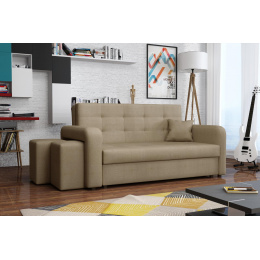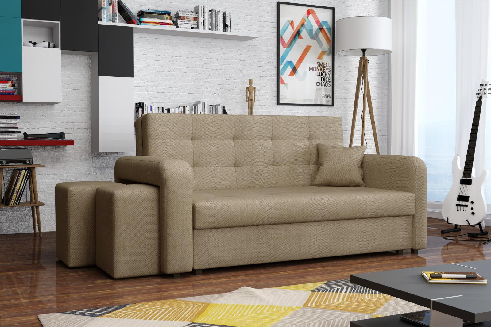 Rozkládací pohovka Vivian je díky svým rozměrům vhodná i do menších pokojů. Své uplatnění najde nejen v obývacím pokoji, ale také v dětském, studentském, nebo hostinském pokoji. Jednoduchým rozložením pomocí automatu, získáte lůžko k příležitostnému přespání Vaší návštěvy. Výplň sedáku tvoří vlnité pružiny v kombinaci s PUR pěnou. Pohovka je potažena kvalitní látkou a nabízíme ji v několika trendy odstínech. Pohovka disponuje i nepostradatelným úložným prostorem, který využijete např. na deku a polštář. V ceně pohovky je 1 dekorační polštář a 2 taburety, které jsou důmyslně uložené v područi pohovky. Taburety můžety využít k sezení, nebo k podepření nohou při odpočinku. Ostatní vyobrazené dekorace nejsou v ceně. Vlivem nastavení monitorů, nebo displejů telefonů, se zobrazení barev na fotograii může od skutečnosti lišit. Vyobrazené dopňky a dekorace nejsou v ceně.