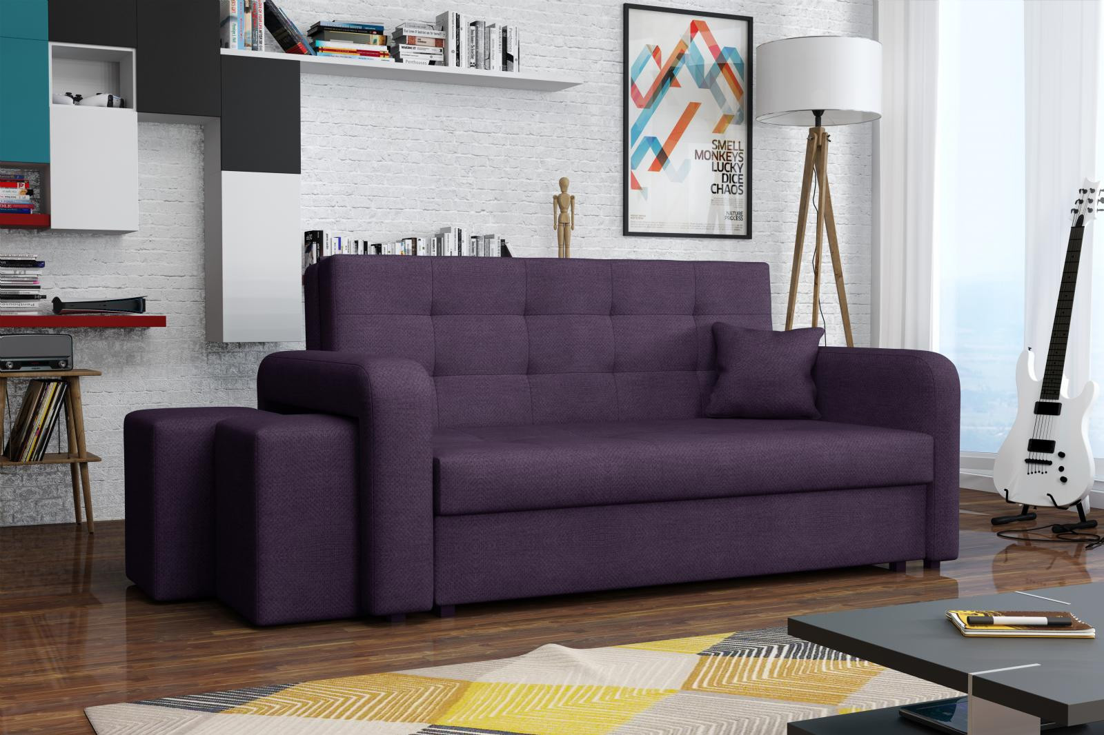 Rozkládací pohovka Vivian je díky svým rozměrům vhodná i do menších pokojů. Své uplatnění najde nejen v obývacím pokoji, ale také v dětském, studentském, nebo hostinském pokoji. Jednoduchým rozložením pomocí automatu, získáte lůžko k příležitostnému přespání Vaší návštěvy. Výplň sedáku tvoří vlnité pružiny v kombinaci s PUR pěnou. Pohovka je potažena kvalitní látkou a nabízíme ji v několika trendy odstínech. Pohovka disponuje i nepostradatelným úložným prostorem, který využijete např. na deku a polštář. V ceně pohovky je 1 dekorační polštář a 2 taburety, které jsou důmyslně uložené v područi pohovky. Taburety můžety využít k sezení, nebo k podepření nohou při odpočinku. Ostatní vyobrazené dekorace nejsou v ceně. Vlivem nastavení monitorů, nebo displejů telefonů, se zobrazení barev na fotograii může od skutečnosti lišit. Vyobrazené dopňky a dekorace nejsou v ceně.