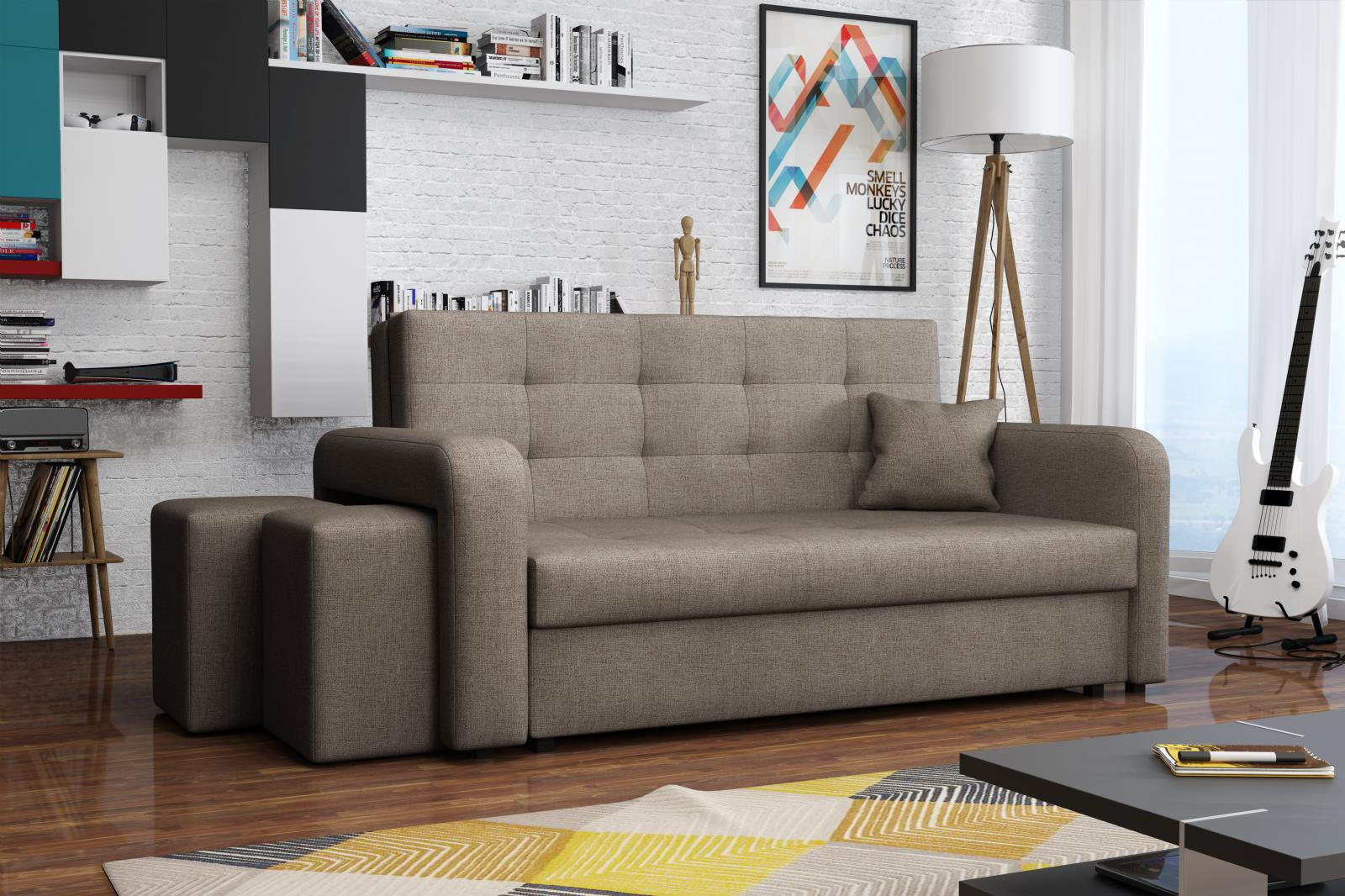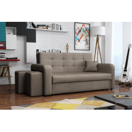 Rozkládací pohovka Vivian je díky svým rozměrům vhodná i do menších pokojů. Své uplatnění najde nejen v obývacím pokoji, ale také v dětském, studentském, nebo hostinském pokoji. Jednoduchým rozložením pomocí automatu, získáte lůžko k příležitostnému přespání Vaší návštěvy. Výplň sedáku tvoří vlnité pružiny v kombinaci s PUR pěnou. Pohovka je potažena kvalitní látkou a nabízíme ji v několika trendy odstínech. Pohovka disponuje i nepostradatelným úložným prostorem, který využijete např. na deku a polštář. V ceně pohovky je 1 dekorační polštář a 2 taburety, které jsou důmyslně uložené v područi pohovky. Taburety můžety využít k sezení, nebo k podepření nohou při odpočinku. Ostatní vyobrazené dekorace nejsou v ceně. Vlivem nastavení monitorů, nebo displejů telefonů, se zobrazení barev na fotograii může od skutečnosti lišit. Vyobrazené dopňky a dekorace nejsou v ceně.