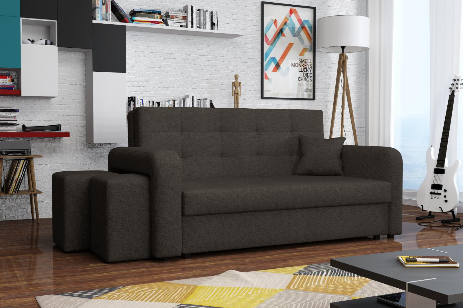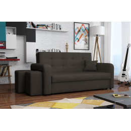 Rozkládací pohovka Vivian je díky svým rozměrům vhodná i do menších pokojů. Své uplatnění najde nejen v obývacím pokoji, ale také v dětském, studentském, nebo hostinském pokoji. Jednoduchým rozložením pomocí automatu, získáte lůžko k příležitostnému přespání Vaší návštěvy. Výplň sedáku tvoří vlnité pružiny v kombinaci s PUR pěnou. Pohovka je potažena kvalitní látkou a nabízíme ji v několika trendy odstínech. Pohovka disponuje i nepostradatelným úložným prostorem, který využijete např. na deku a polštář. V ceně pohovky je 1 dekorační polštář a 2 taburety, které jsou důmyslně uložené v područi pohovky. Taburety můžety využít k sezení, nebo k podepření nohou při odpočinku. Ostatní vyobrazené dekorace nejsou v ceně. Vlivem nastavení monitorů, nebo displejů telefonů, se zobrazení barev na fotograii může od skutečnosti lišit. Vyobrazené dopňky a dekorace nejsou v ceně.