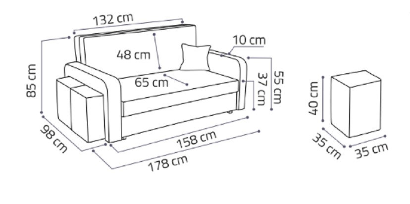 rozměry: šířka 158 cm, výška 85 cm, hloubka 98 cm, taburet: 35x35 cm / výška 40 cm