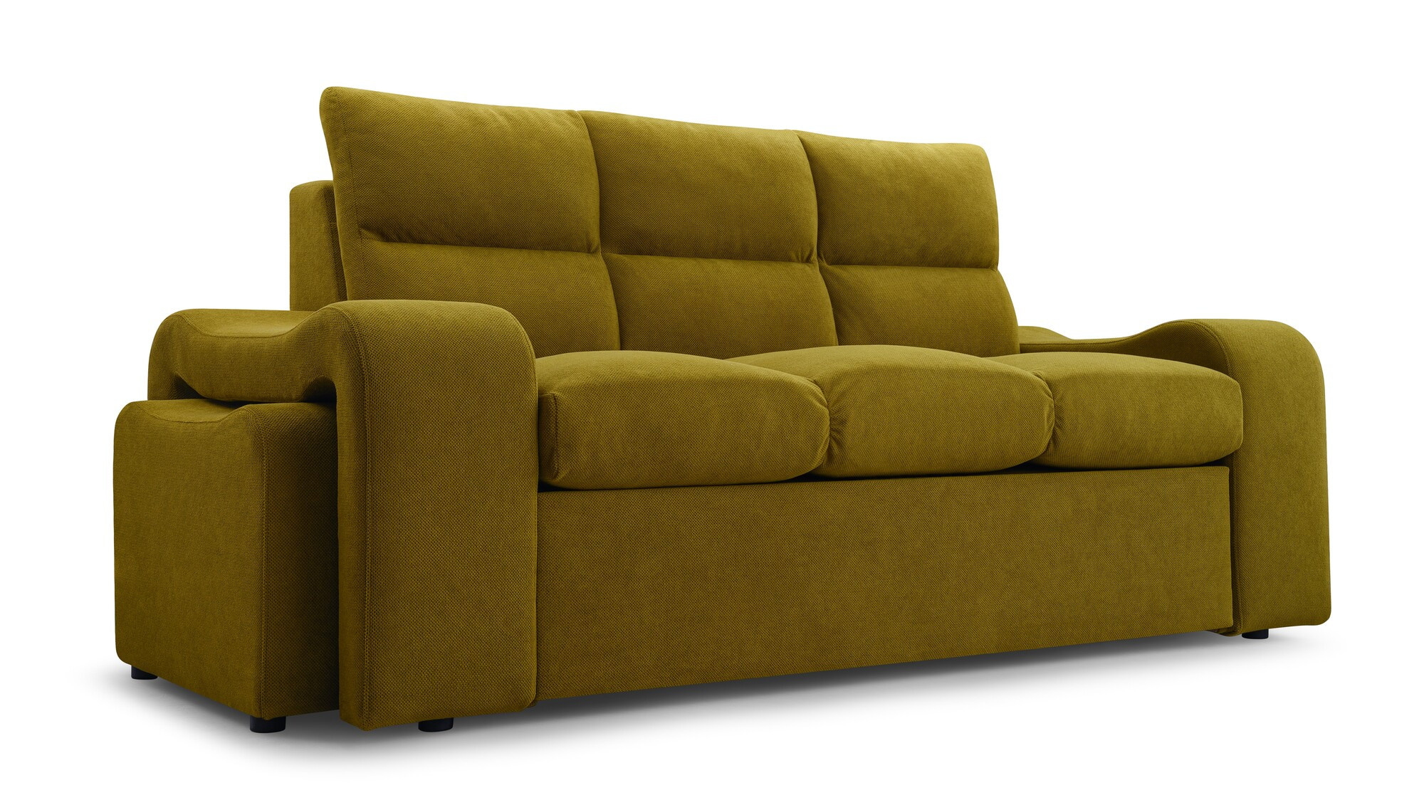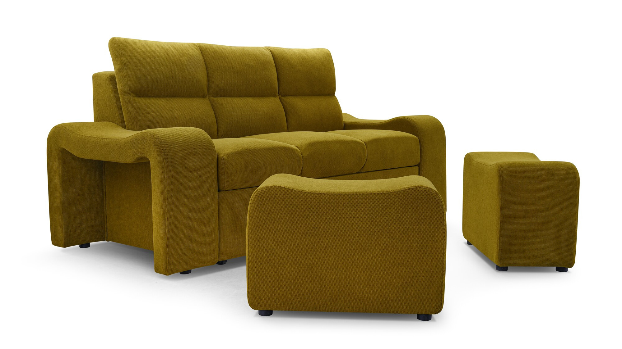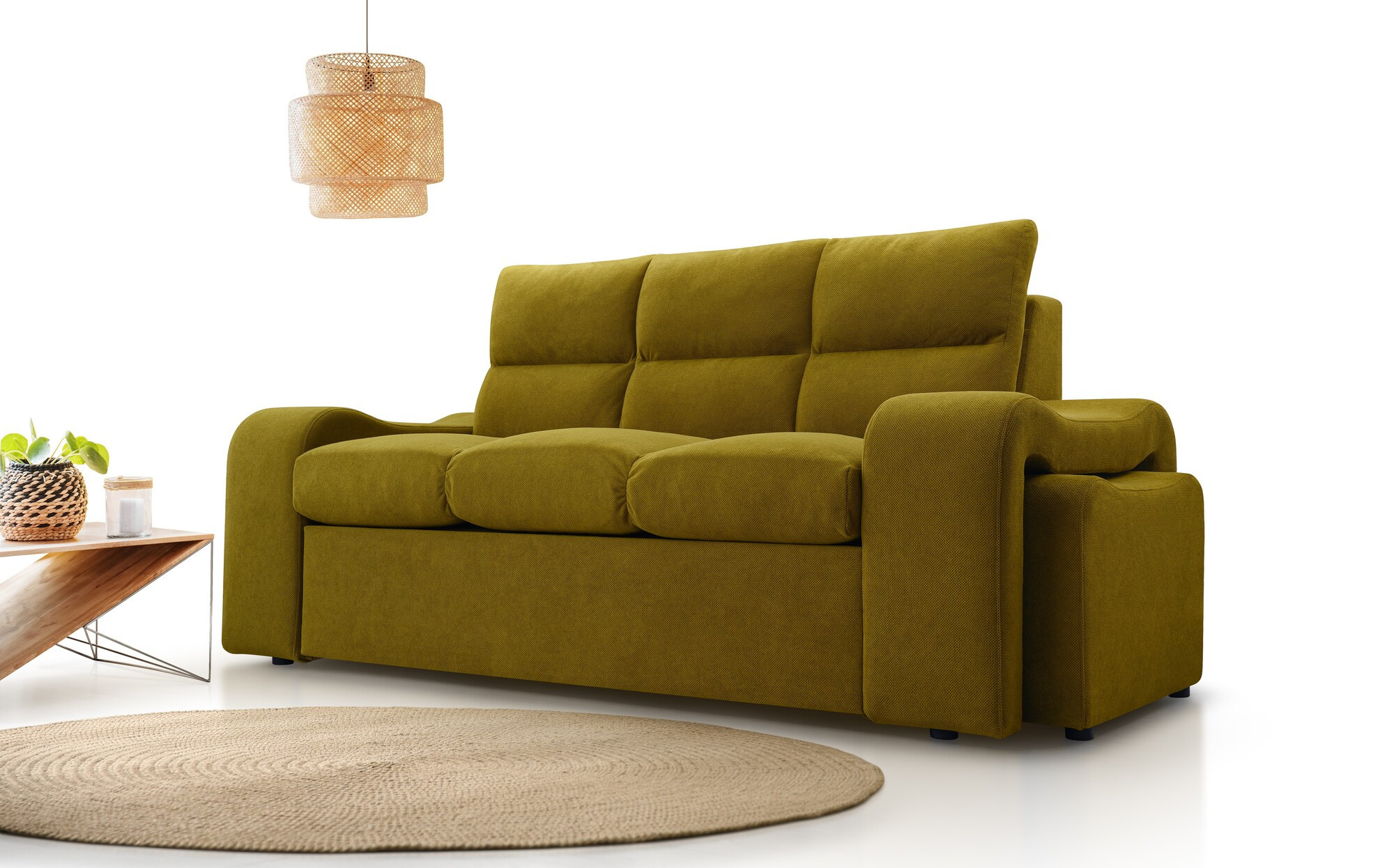 WELA je masivní pohovka s originálním designem, která se skvěle hodí do moderně zařízeného obývacího pokoje pro volný čas. Tvarovaná pohovka stojí na nízkých chromovaných nožkách, které nábytku dodávají moderní nádech. Boční rozkládací pohovka je vybavena funkcí automatického asistovaného rozkládání, díky které můžete pohovku rychle a efektivně proměnit v pohodlné a bezpečné lůžko. Pohovka WENUS s funkcí spaní má zabudovaný úložný prostor na taburety - souprava obsahuje dva taburety, které lze použít jako další sedadlo, a praktické podnožky při odpočinku. Pohovka s bočnicemi je navíc vybavena prostorným úložným prostorem na lůžkoviny, do kterého lze snadno uložit přikrývky, polštáře a další předměty denní potřeby. Představený model se vyrábí na speciální objednávku, takže si můžete vybrat z široké škály barev látek, díky nimž můžete nábytek dokonale sladit s uspořádanou místností.
