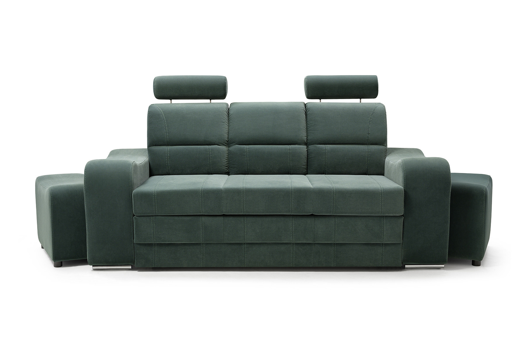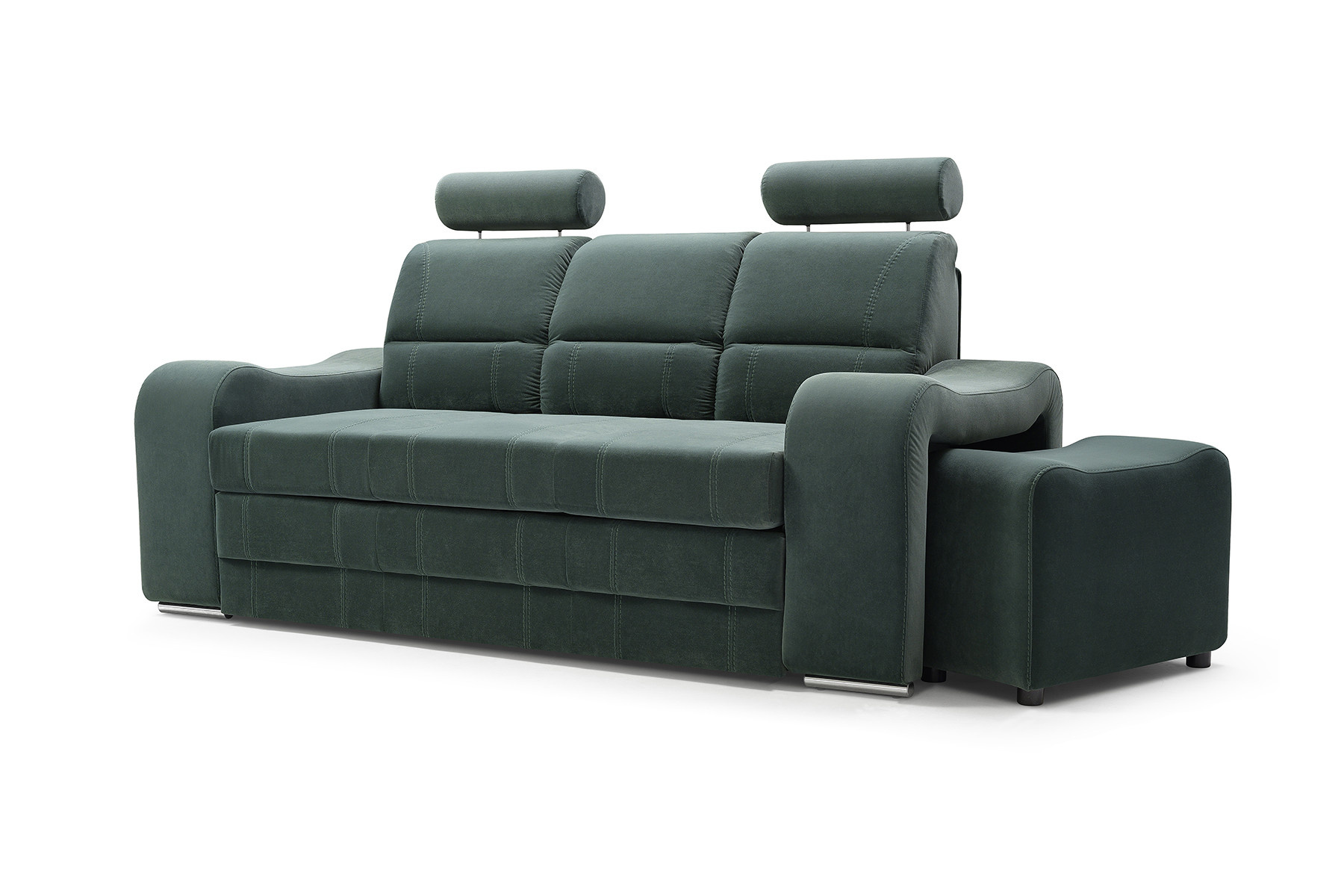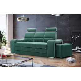 WENUS je masivní pohovka s originálním designem, která se skvěle hodí do moderně zařízeného obývacího pokoje pro volný čas. Tvarovaná pohovka stojí na nízkých chromovaných nožkách, které nábytku dodávají moderní nádech. Boční rozkládací pohovka je vybavena funkcí automatického asistovaného rozkládání, díky které můžete pohovku rychle a efektivně proměnit v pohodlné a bezpečné lůžko. Pohovka WENUS s funkcí spaní má zabudovaný úložný prostor na taburety - souprava obsahuje dva taburety, které lze použít jako další sedadlo, a praktické podnožky při odpočinku. Pohovka s bočnicemi je navíc vybavena prostorným úložným prostorem na lůžkoviny, do kterého lze snadno uložit přikrývky, polštáře a další předměty denní potřeby. Představený model se vyrábí na speciální objednávku, takže si můžete vybrat z široké škály barev látek, díky nimž můžete nábytek dokonale sladit s uspořádanou místností. Moderní kus nábytku je vyplněn HR pěnou na opěradle a pěnou T-30 na sedáku, což zajistí pohodlí a komfort i při mnohahodinovém sezení. Pohovka WENUS je volně stojící kus nábytku, a proto je čalouněná i zadní část pohovky - lze ji umístit nejen ke stěně, ale i do centrální části místnosti.