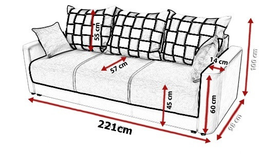 Moderní rozkládací pohovka s úložným prostorem. Výplň pohovky tvoří pružiny bonell a faliste v kombinaci s kvalitní PUR pěnou. Jednoduchým rozkladem pomocí automatu vznikne lůžko vhodné k příležitostnému spaní. Pohovku dodáváme v několika barevných provedeních, které také naleznete v naší nabídce. Rozpis rozměrů najdete na přiloženém obrázku s nákresem. V ceně pohovky jsou 3 velké kostkované polštáře a 2 malé polštáře v barvě pohovky. Ostatní vyobrazené dekorace nejsou v ceně.