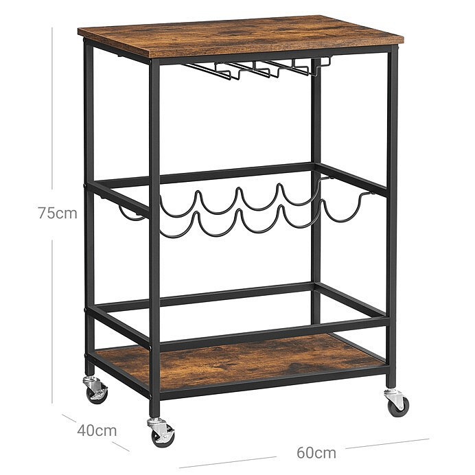 Servírovací stolek s dekorem old wood kombinuje MDF desku v hnědém odstínu s pevnou kovovou konstrukcí v černé barvě, která zajišťuje stabilitu a dlouhou životnost. Stolek je vybaven praktickými držáky na lahve a sklenice, které umožňují bezpečné uložení nápojů a snadný přístup během servírování. Kolečka s brzdou zajišťují jednoduchou manipulaci a zároveň stabilitu při použití. Horní a spodní police poskytují dostatek prostoru pro další potřeby, zatímco kompaktní rozměry usnadňují umístění v různých typech interiérů. Nadčasový design a kombinace materiálů dělají z tohoto stolku funkční doplněk vhodný do moderních i rustikálních prostor.