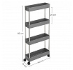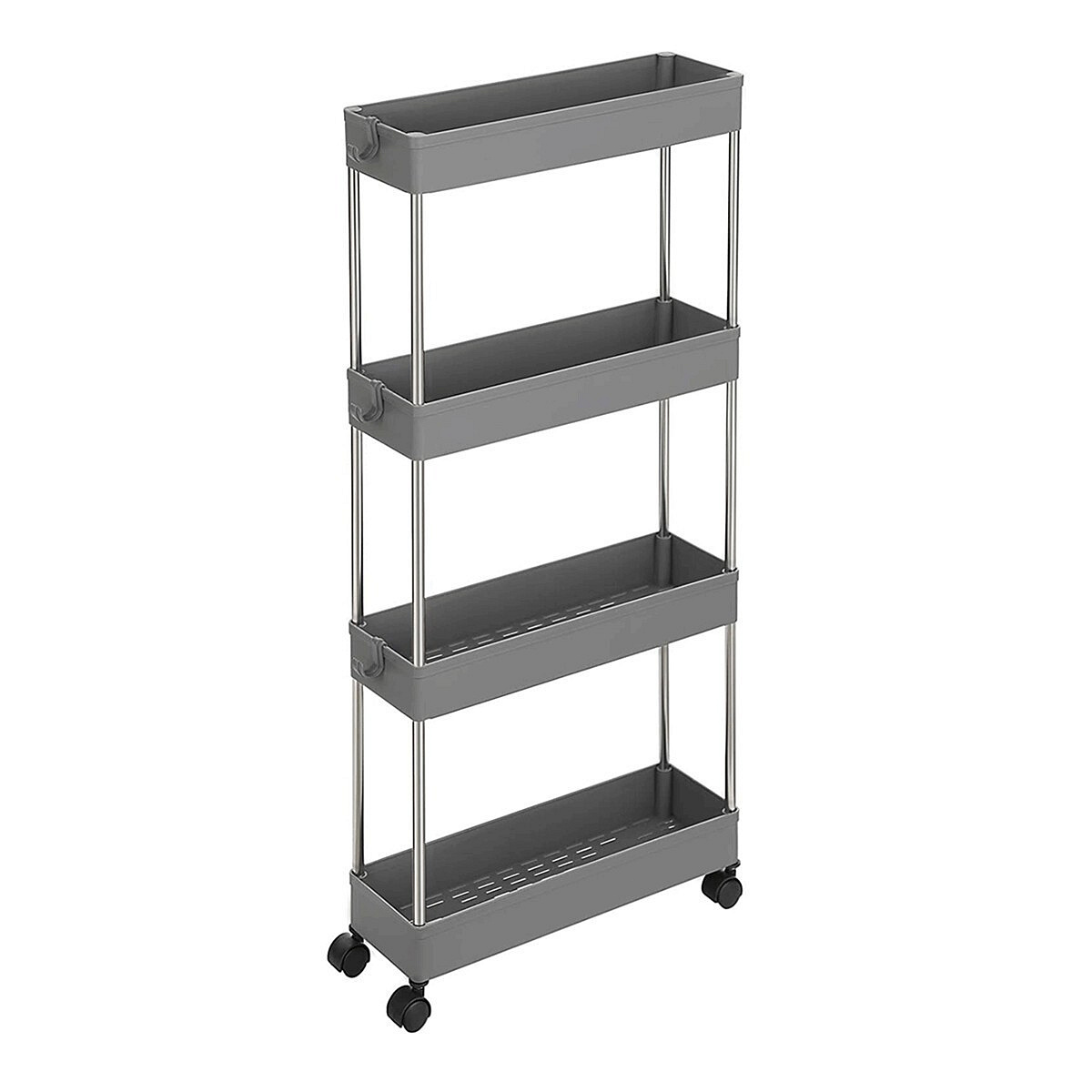 Úložný vozík s čtyřmi policemi kombinuje pevnou kovovou konstrukci s odolnými šedými plastovými policemi, které poskytují dostatek prostoru pro organizaci různých předmětů. Vozík je vybaven plastovými kolečky, která zajišťují snadnou mobilitu a umožňují pohodlné přemístění i v omezených prostorách. Díky kompaktním rozměrům a praktickému uspořádání polic je vhodný do kanceláří, dílen i domácností. Kovové sloupky dodávají stabilitu a zaručují dlouhou životnost produktu. Celková konstrukce je navržena tak, aby usnadnila přístup k uloženým věcem a zároveň šetřila místo.