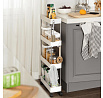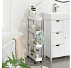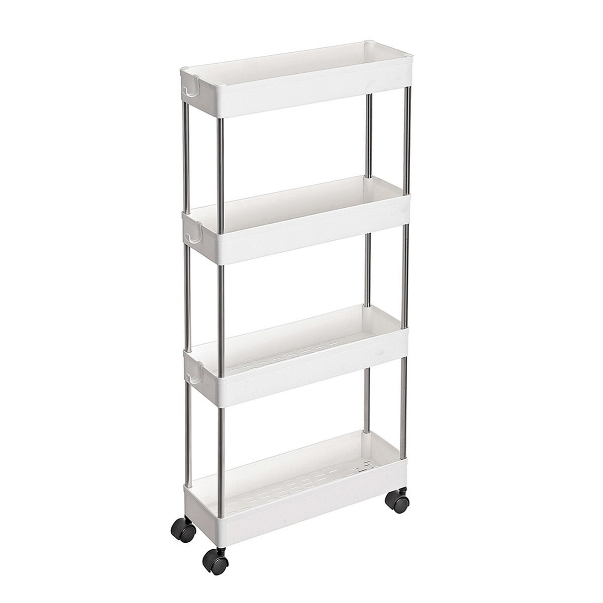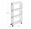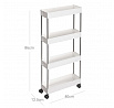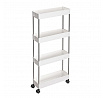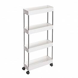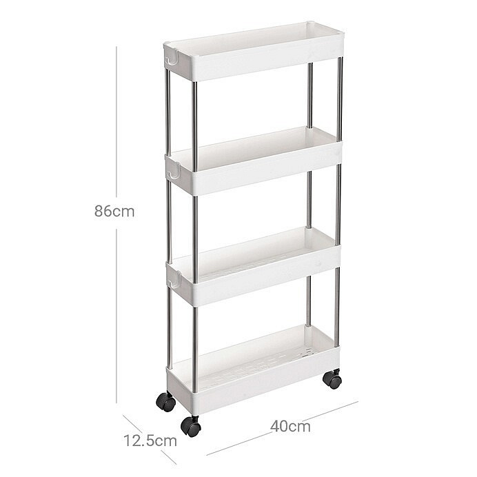 Pojízdný úložný vozík s čtyřmi policemi nabízí praktické řešení pro organizaci drobných předmětů v domácnosti či kanceláři. Police jsou vyrobeny z bílého plastu, který se snadno udržuje, a jsou propojeny kovovými tyčemi zajišťujícími stabilitu celého vozíku. Vozík je vybaven plastovými kolečky, která umožňují snadnou manipulaci a přesun v prostoru. Kompaktní rozměry a otevřená konstrukce polic usnadňují přístup k uloženým věcem a zároveň šetří místo.