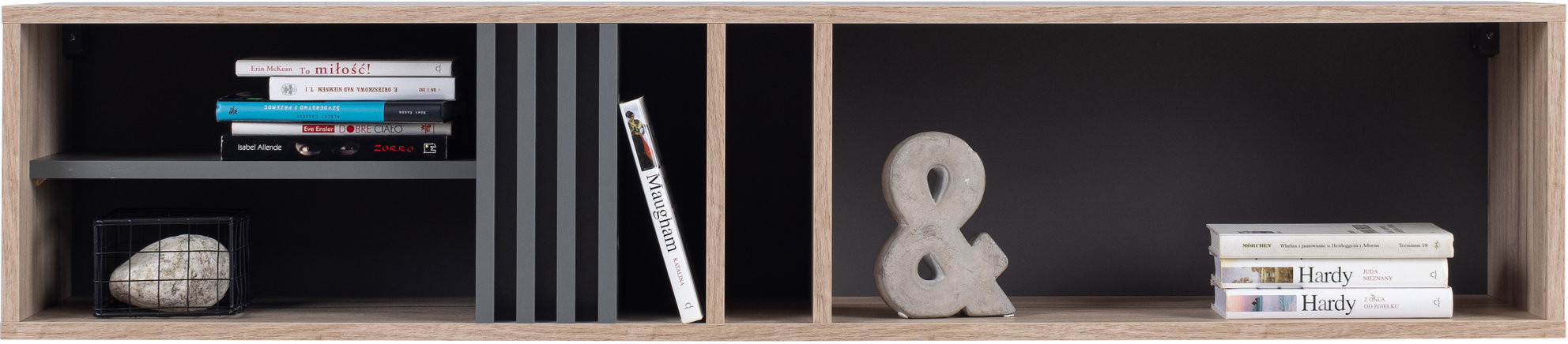 Systém ALLMO je vyroben v barevném provedení Dub Estana světlá / Antracit. Korpus nábytku je vyroben v barevném odstínu Dub Estana světlá.