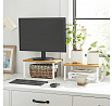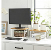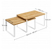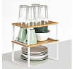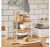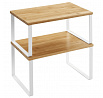 Set kuchyňských poliček kombinuje přírodní bambusové desky s bílými kovovými rámy, které zajišťují stabilitu a moderní vzhled. Poličky nabízejí dva odkládací prostory vhodné pro uspořádání kuchyňských doplňků, koření nebo menších nádobí. Bambusové desky jsou hladké s jemnou texturou, která přináší do prostoru přírodní atmosféru a snadnou údržbu. Bílý kovový rám je lakovaný práškovou metodou, což zvyšuje jeho odolnost vůči opotřebení. Díky kompaktním rozměrům je tento set ideální pro využití v menších kuchyních nebo jako doplněk na pracovní desku.